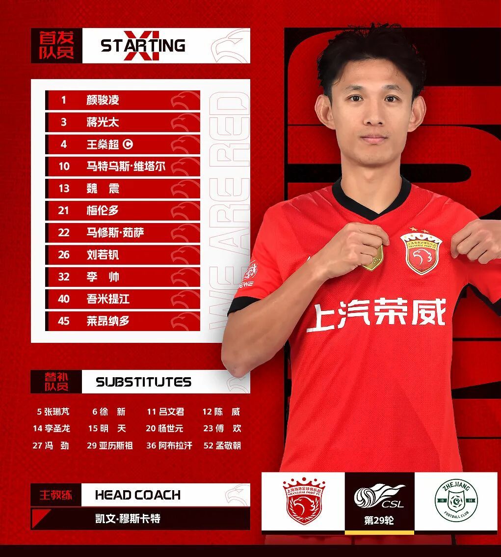 首发:1-颜骏凌、3-蒋光太、4-王燊超、13-魏震、32-李帅、40-吾米提江-玉苏普、10-马特乌斯-维塔尔(F)、21-梅伦多(F)、22-马修斯-茹萨(F)、26-刘若钒、45-莱昂纳多(F)