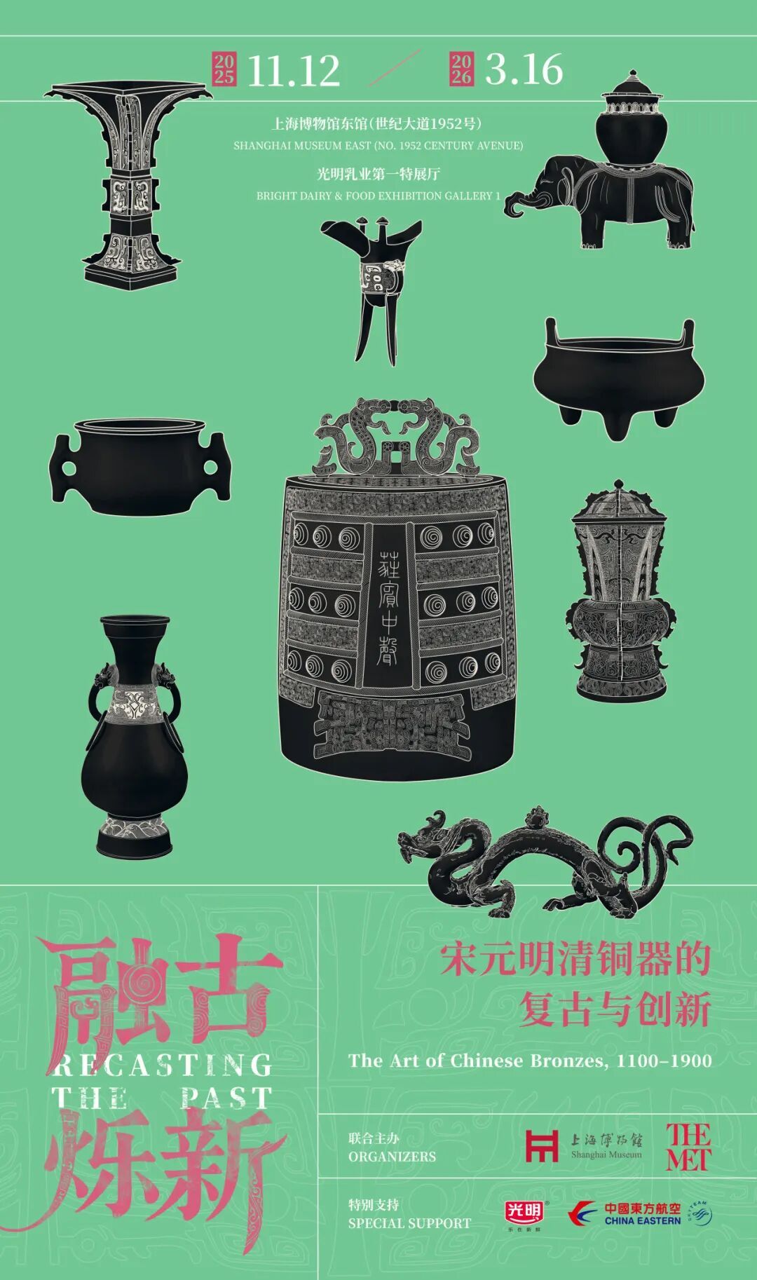 为全新解读中国宋元明清时期的社会面貌和精神世界,带领观众领略这一时期青铜艺术的独特魅力,上海博物馆与大都会艺术博物馆共同主办了“融古烁新:宋元明清铜器的复古与创新”特展。展览首站已于今年2月28日至9月28日在纽约成功举办,并将于2025年11月12日至2026年3月16日在上海博物馆东馆举办。展览基于上海博物馆藏宋、元、明、清铜器,并携手大都会艺术博物馆,汇集海内外多家重要博物馆馆藏,展品总计约一百七十八件,是近年来海内外最具规模的宋、元、明、清铜器展。展品中还包括书画、陶瓷等各类文物,以期更完整地呈现与铜器共通的文化大环境。