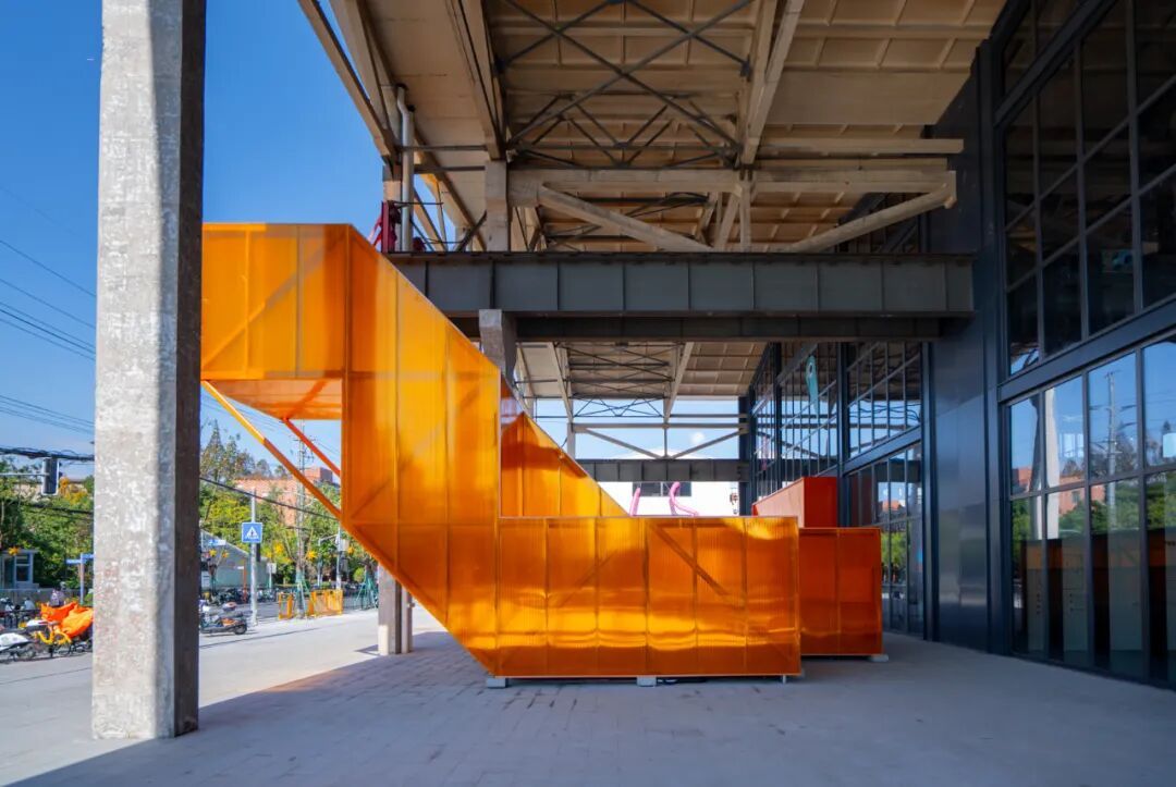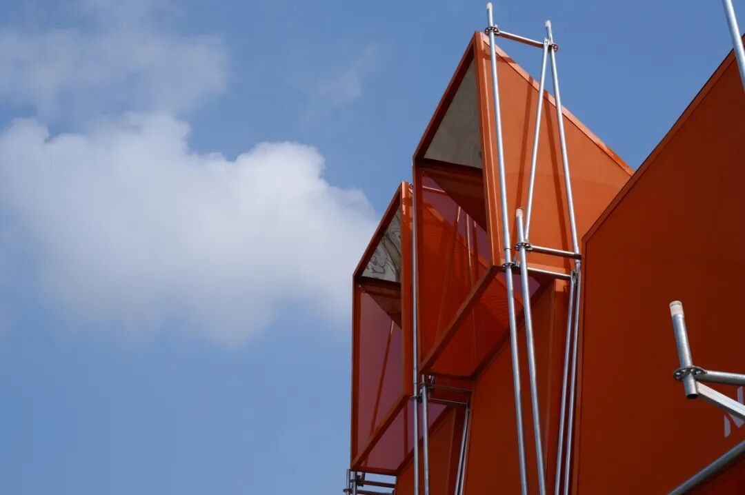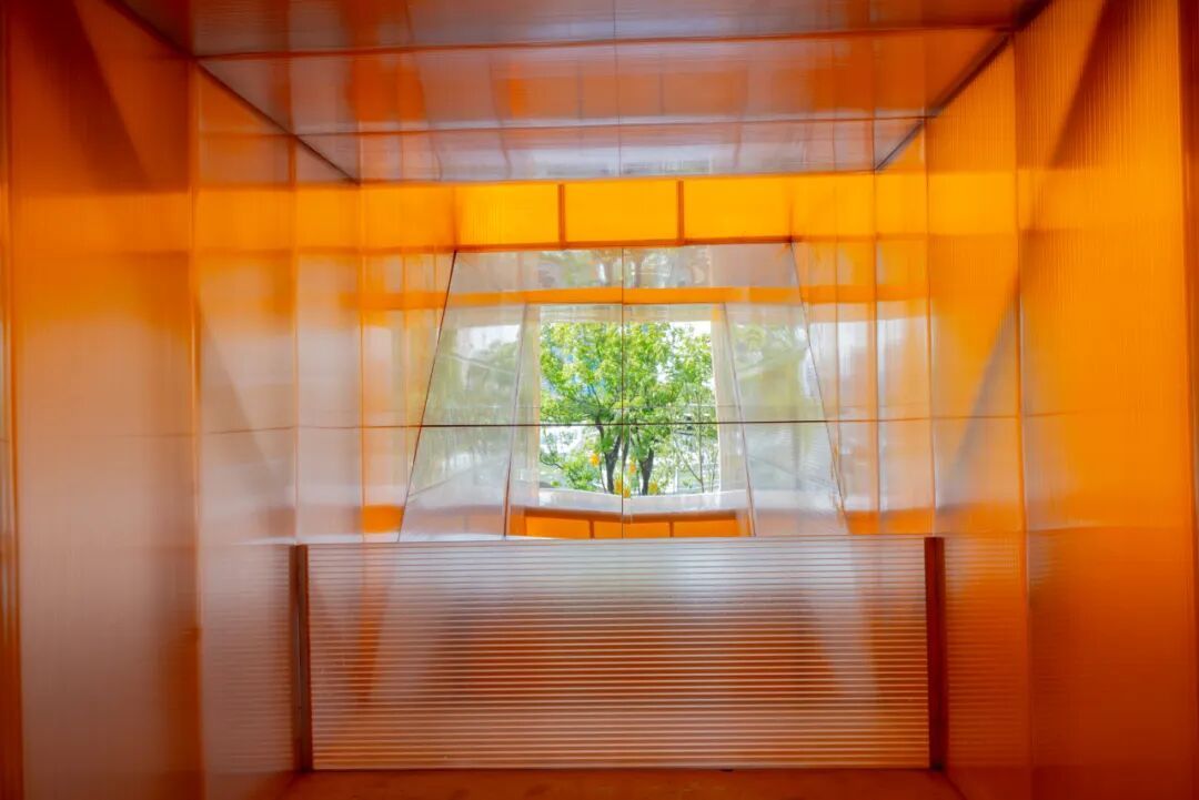 作品位于 A 馆西侧入口门廊下,基于潜望镜原理,以下合上分的双筒形式向西挑探,传达出登高望远的意向,并将夕阳西下时的胜景转换投射至首层,形成一个集登记、问询、打卡于一体的公共空间。高度模数化的等截面钢结构体系与内外双层叠透的阳光板围护系统,既方便了快速施工与拆除,又调节了不同气候条件下的室内热环境。