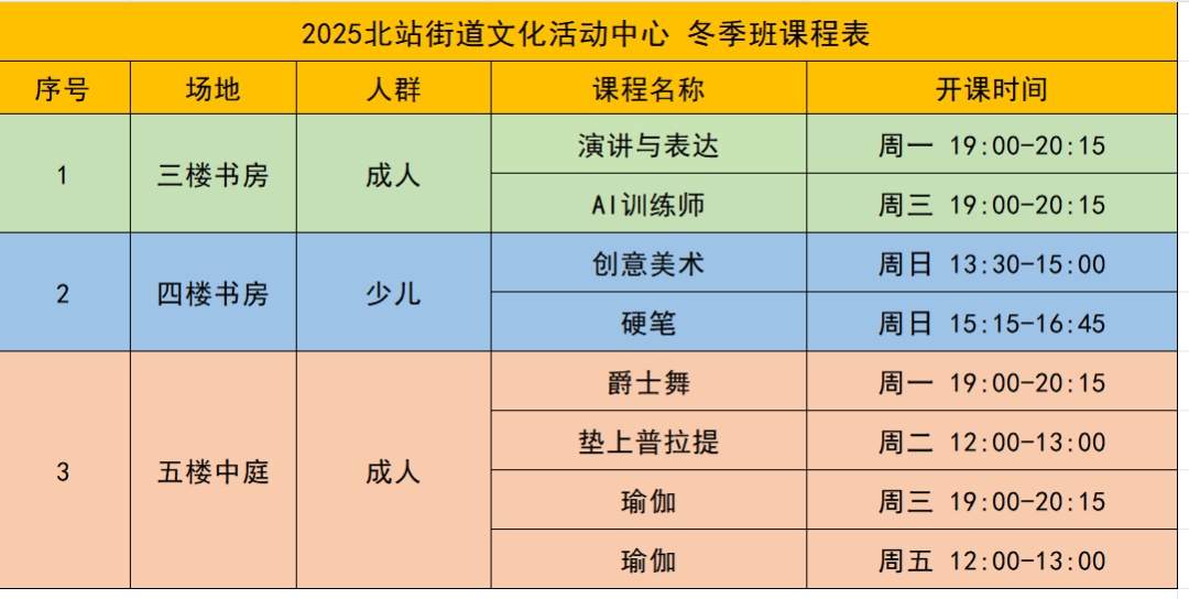 为更好地满足市民下班后以及青少年假期中的文化需求,本次冬季班在延续以往经典课程的基础上,进一步拓展了内容广度与深度。15门精心设计的课程包括瑜伽、普拉提、爵士舞、主持、硬笔、科创实验、AI训练师,并在此基础上增加了化妆、短视频剪辑、燃脂操、跳绳、围棋等,让更多居民得以体验高质量文化艺术对内心的润养。