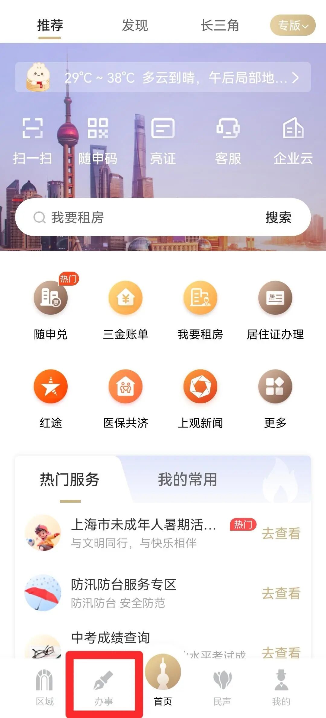 登录“随申办市民云”APP,选择主页下方的“办事”栏目,点击“预约”选项。