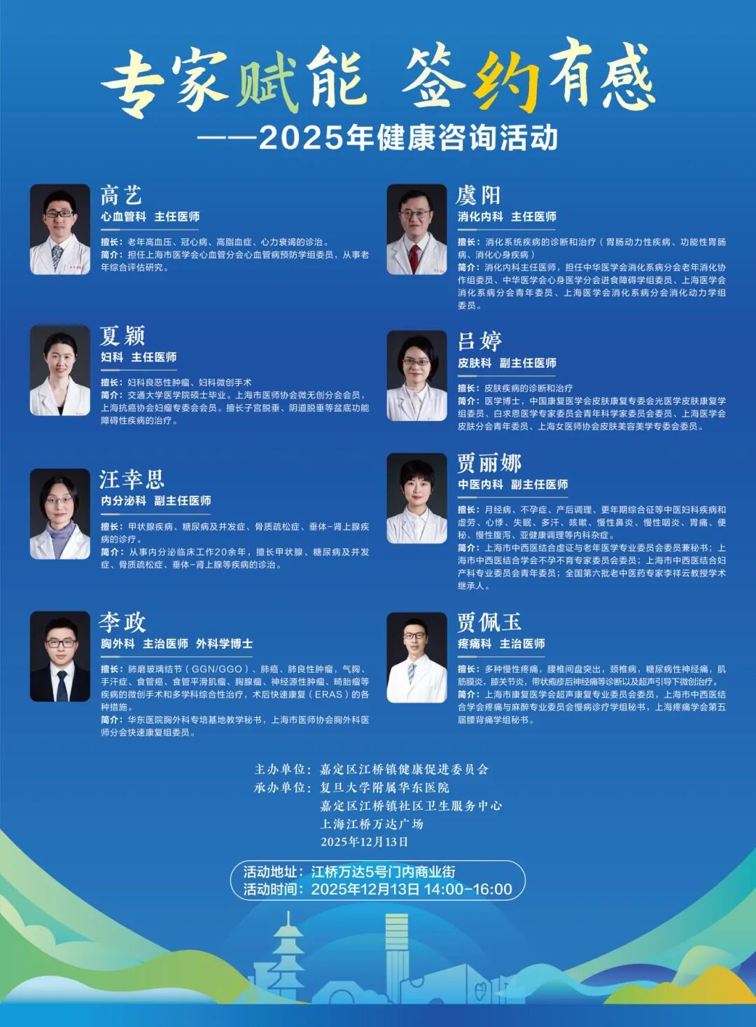 活动邀请复旦大学附属华东医院专家团队,开展心血管科、消化内科、内分泌科、皮肤科、中医内科、胸外科、妇科、疼痛科等多学科联合健康咨询。