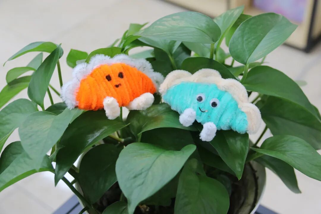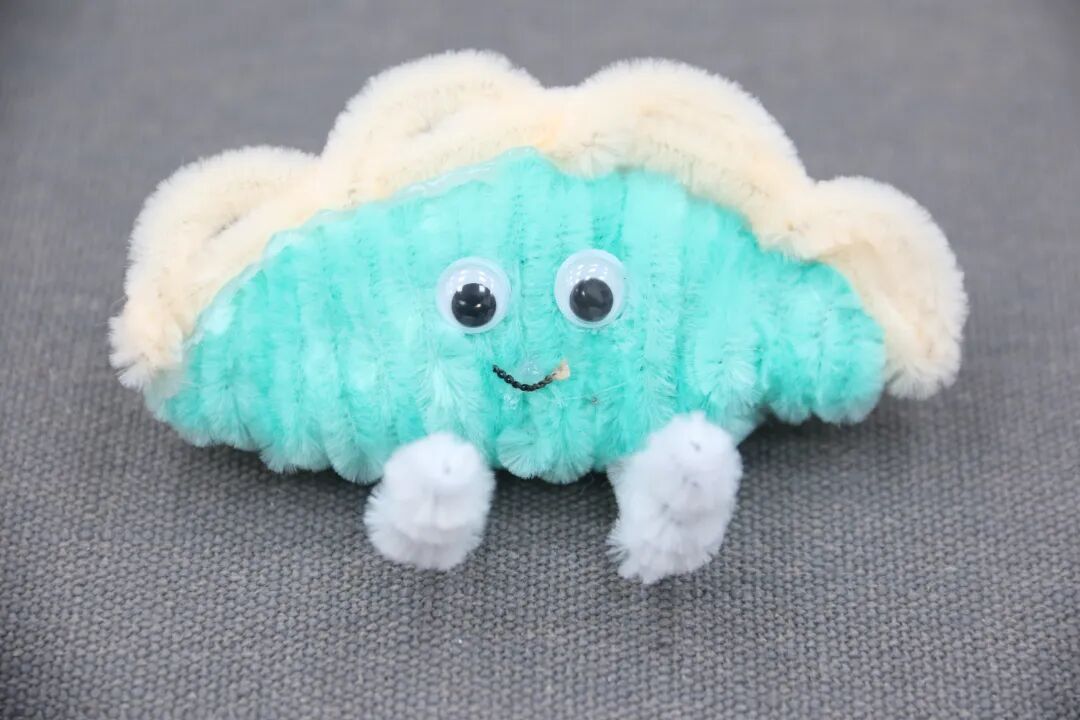 7.将两只小脚从下方插入饺子中,调整形状固定好,扭扭棒饺子就做好啦!