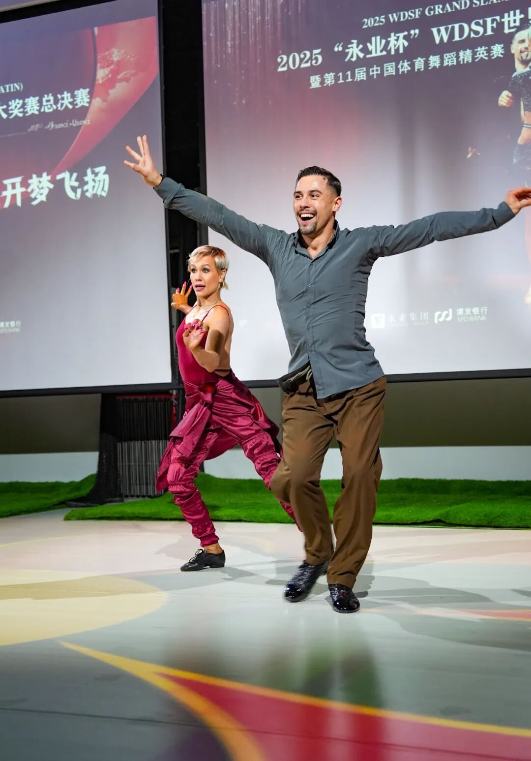 现场氛围格外火热,孩子们在大师的鼓励下渐渐放开手脚,当欢快的舞曲响起,孩子们跟着节奏转动身体、迈开脚步,虽然动作还带着几分稚嫩,但每一个人都格外认真,小脸上洋溢着专注的神情。雅库布和特热扎不时用夸张的舞蹈动作与孩子们互动,当看到有孩子准确跟上节拍时,他们会立刻竖起大拇指给出鼓励。尽管接触时间短暂,孩子们已能自信地跟随节拍起舞,动作虽稚嫩却充满活力,眼神中闪烁着对舞蹈的热爱与憧憬。此次活动,是2025“永业杯”WDSF世界体育舞蹈大奖赛总决赛系列行动的重要一环,也是黄浦区体教融合、艺体协同发展的有力举措。通过让国际顶尖选手走进校园,为孩子们打开了一扇接触世界高水平体育舞蹈的窗口,更在他们心中播下了艺术的种子,在艺术的滋养下迎风飞扬。
