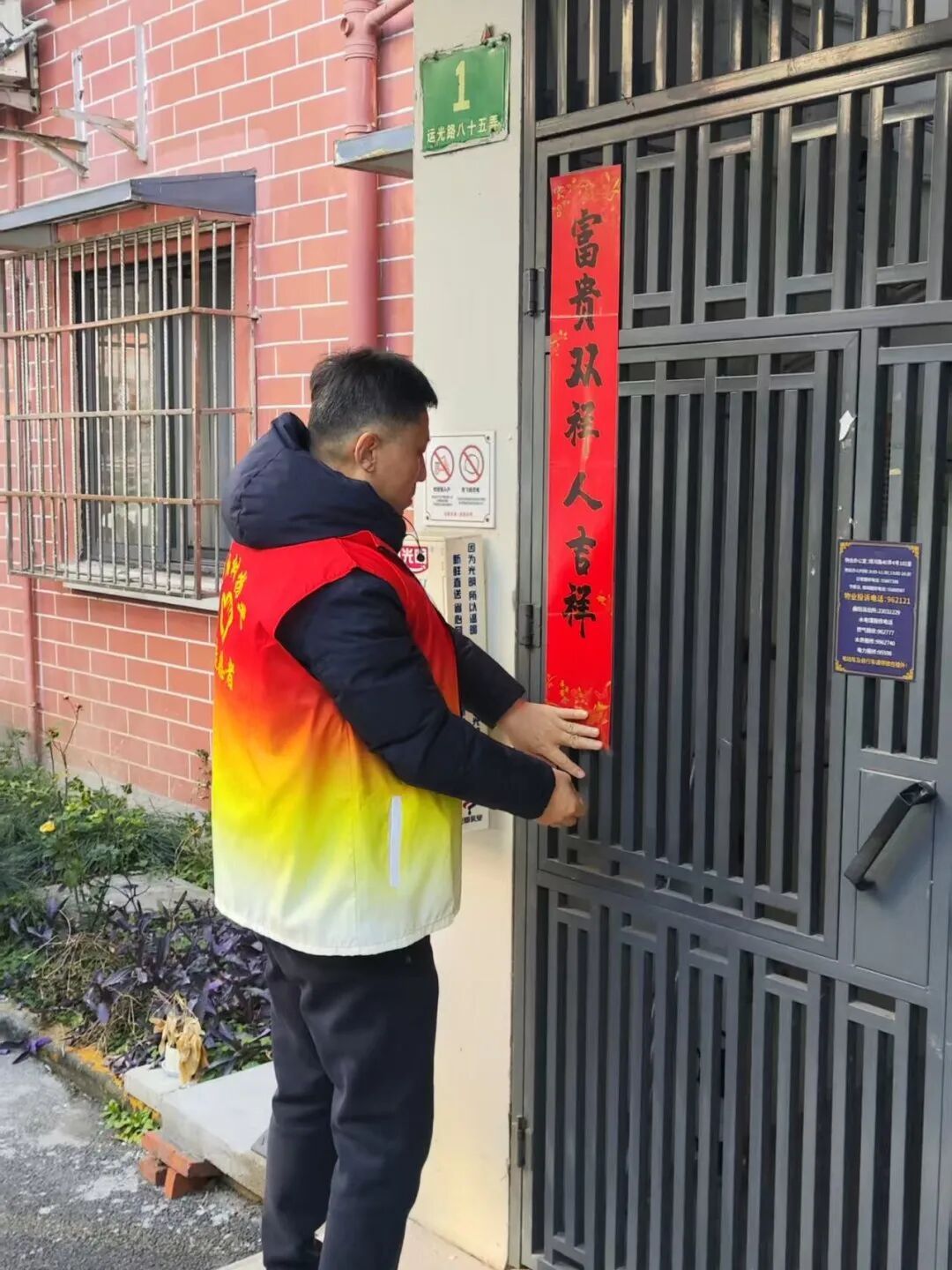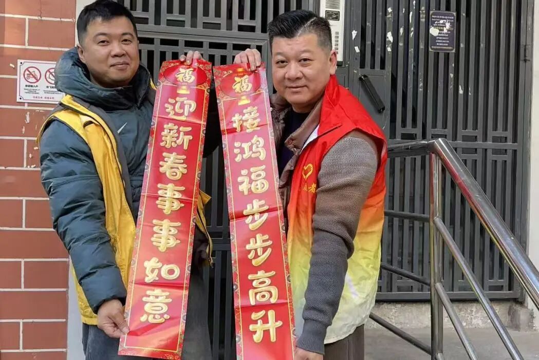 志愿者们高效完成张贴工作后,还为行动不便的老人整理了门前杂物以及现场解答物业服务咨询。活动中,外籍居民希金斯先生被中国年俗文化吸引,了解春联寓意后十分欣喜,主动与志愿者合影,感慨活动让他感受浓浓年味,更快融入社区。