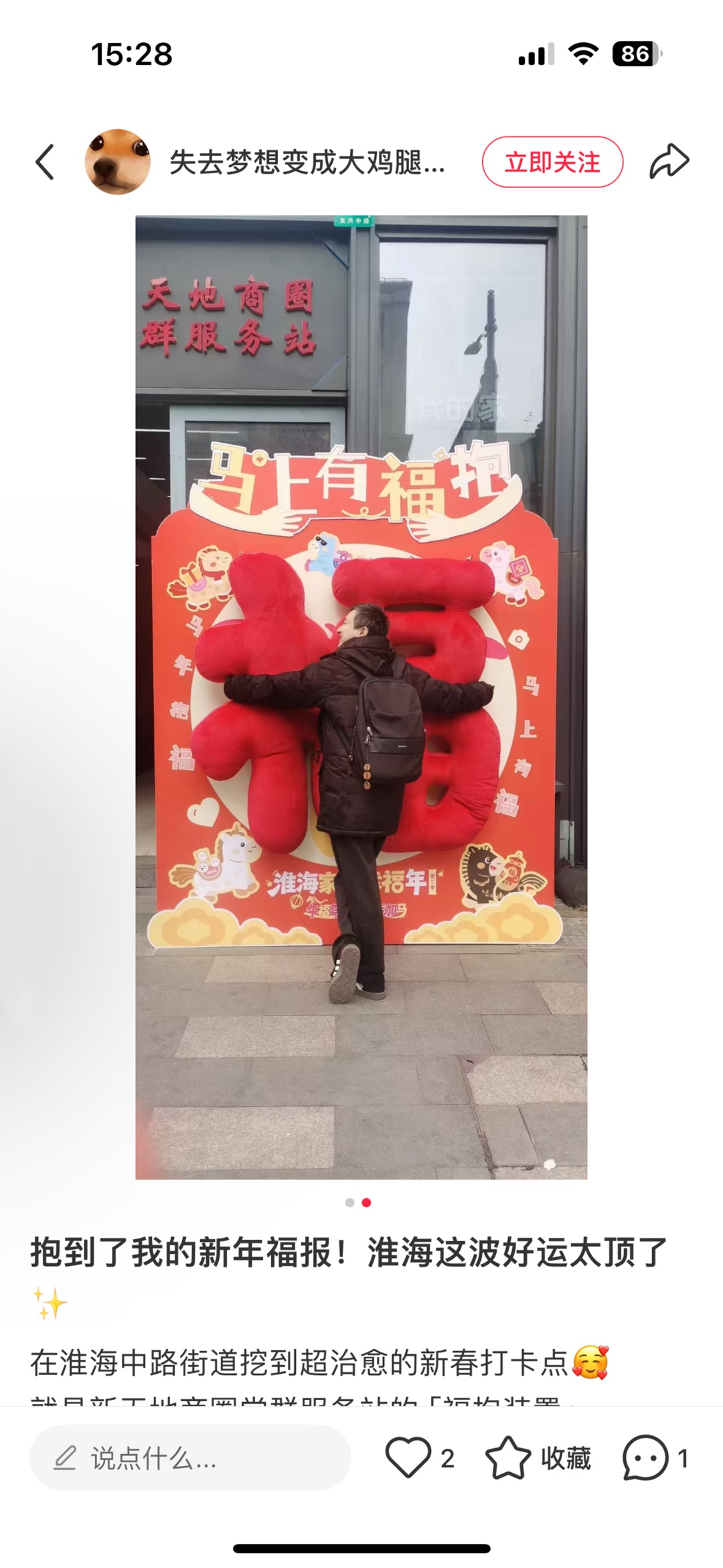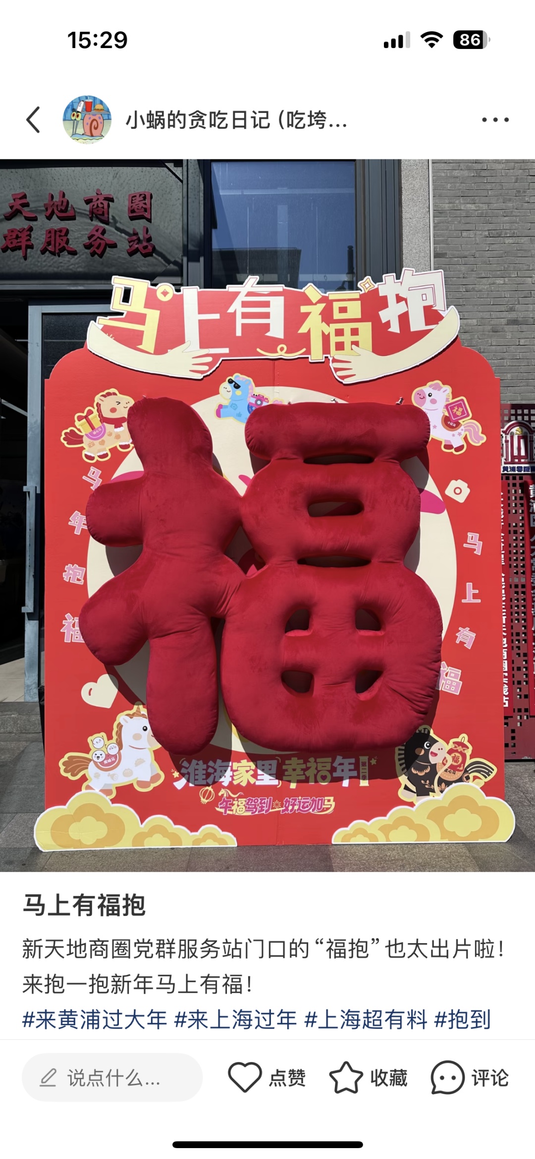 从一大会址・新天地站1号口出站,迎面便是醒目喜庆的 “福抱” 装置,巨大福字格外吸睛,成为街区里一道亮眼的新春风景。在记者采访的过程中,一对来新天地游玩的母女,主动上前与装置合影留念:“看到这么大的福字,特别有过年的氛围,路过都想抱一抱,沾沾新年福气和好彩头。” 说完,便将合影分享至小红书,完成打卡后领取优惠券,把新春喜气与福利一并收入囊中。