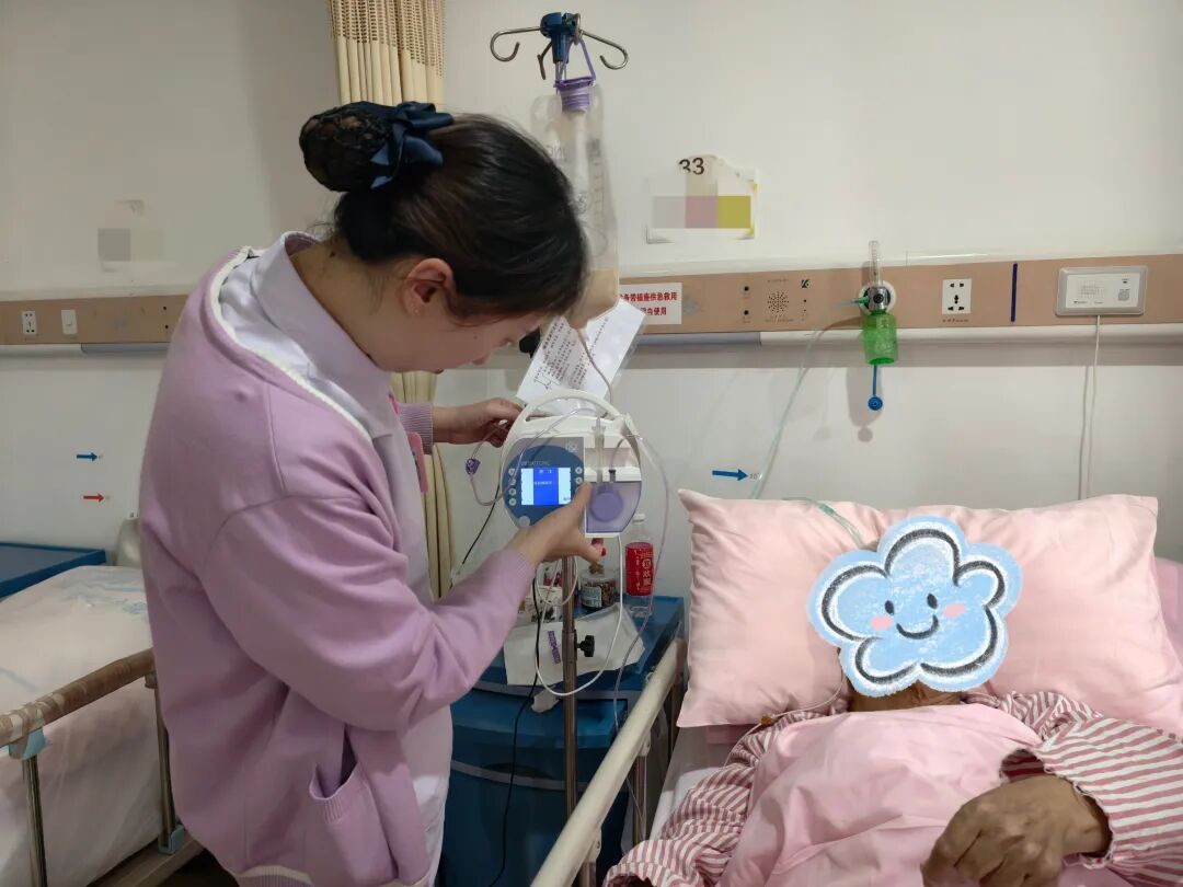 时间回溯到2026年1月26日,施老伯因病情危急,在三甲医院抢救后,转入豫园街道社区卫生服务中心的安宁疗护病区继续接受治疗。彼时,他因身体状况无法经口进食饮水,只能带着鼻空肠管入院。为了能更细致、持续地维持施老伯的营养供给,保障他的生命质量,中心安宁疗护多学科团队迅速行动起来,组织了严谨的会诊。经过团队成员们的深入讨论与分析,最终决定为施老伯个性化引入肠内营养泵,采用匀速、稳定的输注方式为他提供营养支持。这一精准且贴心的治疗方案,如同黑暗中的一束光,为施老伯的康复带来了希望。