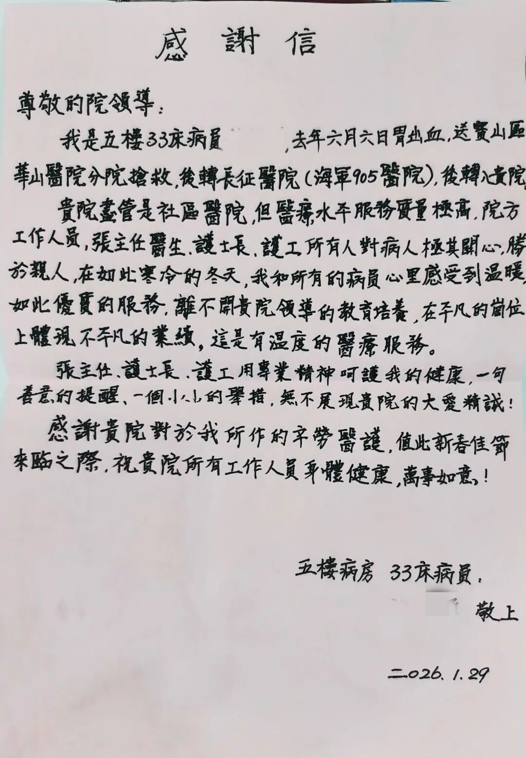 方案实施一周后,营养科的吴逸霄医生和社工部的吕锐工作人员特意前来回访。他们轻轻走进病房,带着温和的笑容,耐心地询问施老伯的感受与需求。在了解到施老伯的实际情况后,他们又根据反馈精心调整了输注的速度与频次。每一个细节都处理得恰到好处,这份贯穿治疗始终的体贴与专业,如同一股暖流,缓缓流淌进施老伯的心田,让他深受感动。于是,施老伯决定提笔,将心中那难以言尽的感激之情,化作纸上那一笔一画的真诚倾诉。