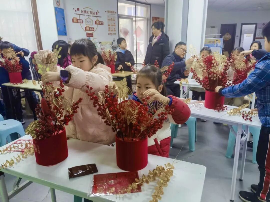 金塘居民区志愿者巧手制作新年福桶,选材、修剪、搭配,邻里之情在一次次交流协作间增进。梅陇十村亲子家庭在剪纸达人的讲解指导下,学习剪纸历史、创作剪裁,一匹匹生肖马栩栩如生、跃然纸上。梅陇五村的亲子家庭以珍珠贴片创作国风珍珠画,传统纹样与巧思相融,代际情感在指尖流淌。梅陇三村青少年体验拓印技艺,铺纸、上墨、拓印,鲜红的福字与骏马图案承载满满期许。梅陇七村、梅陇四村、华理苑居民区也分别开展福桶摆件亲子手工活动,插银柳、挂红包,把年味儿“装”回家。