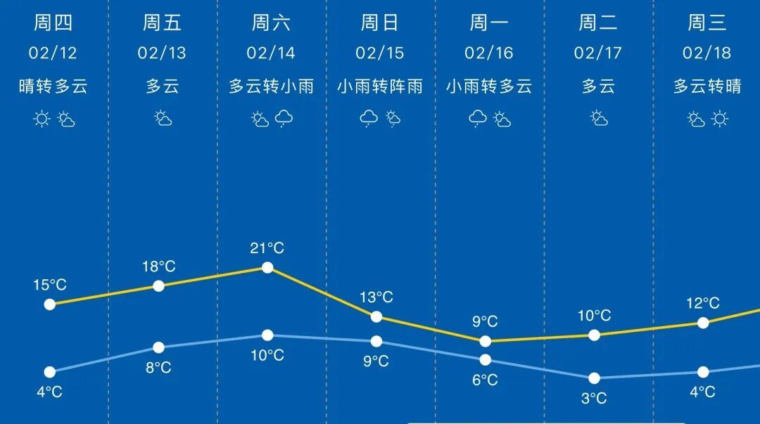 2月14日(周六):多云到阴转阴到多云有时有小雨,10~21℃