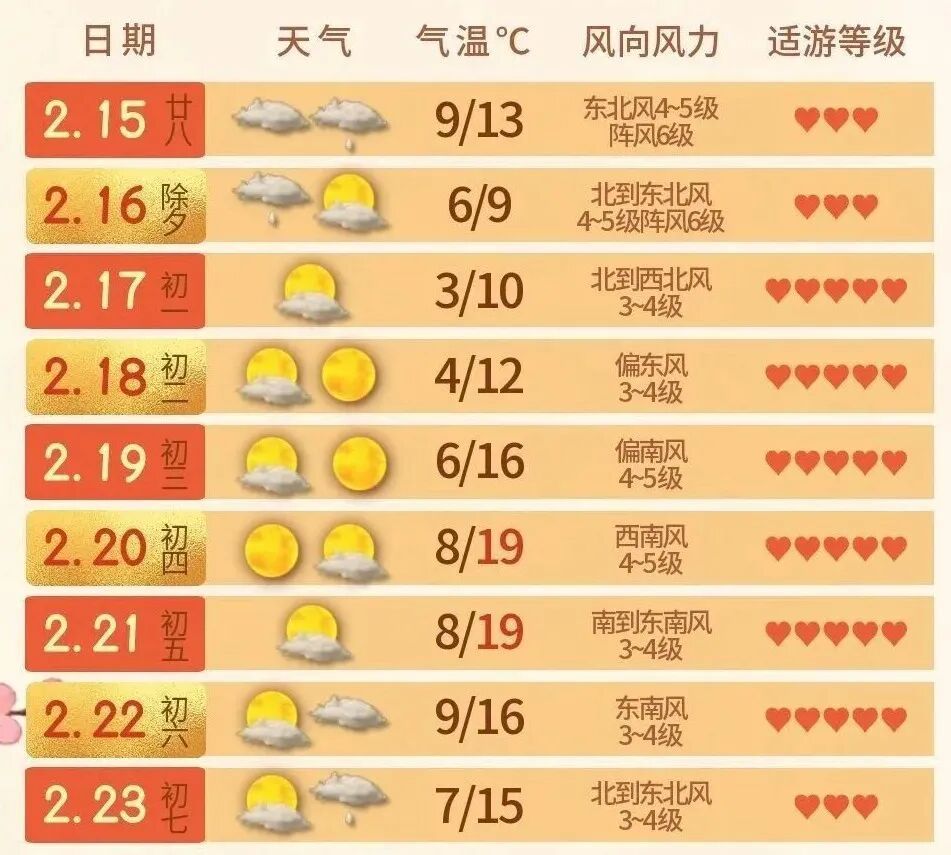 ■春节假期,本市气象条件总体适宜。大部分时间以多云天气为主,降水主要出现在假期初期和后期。详见↓↓