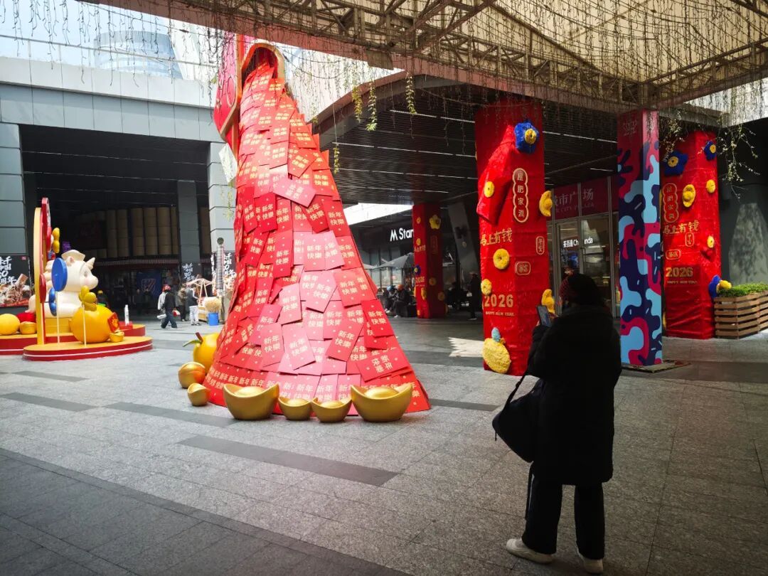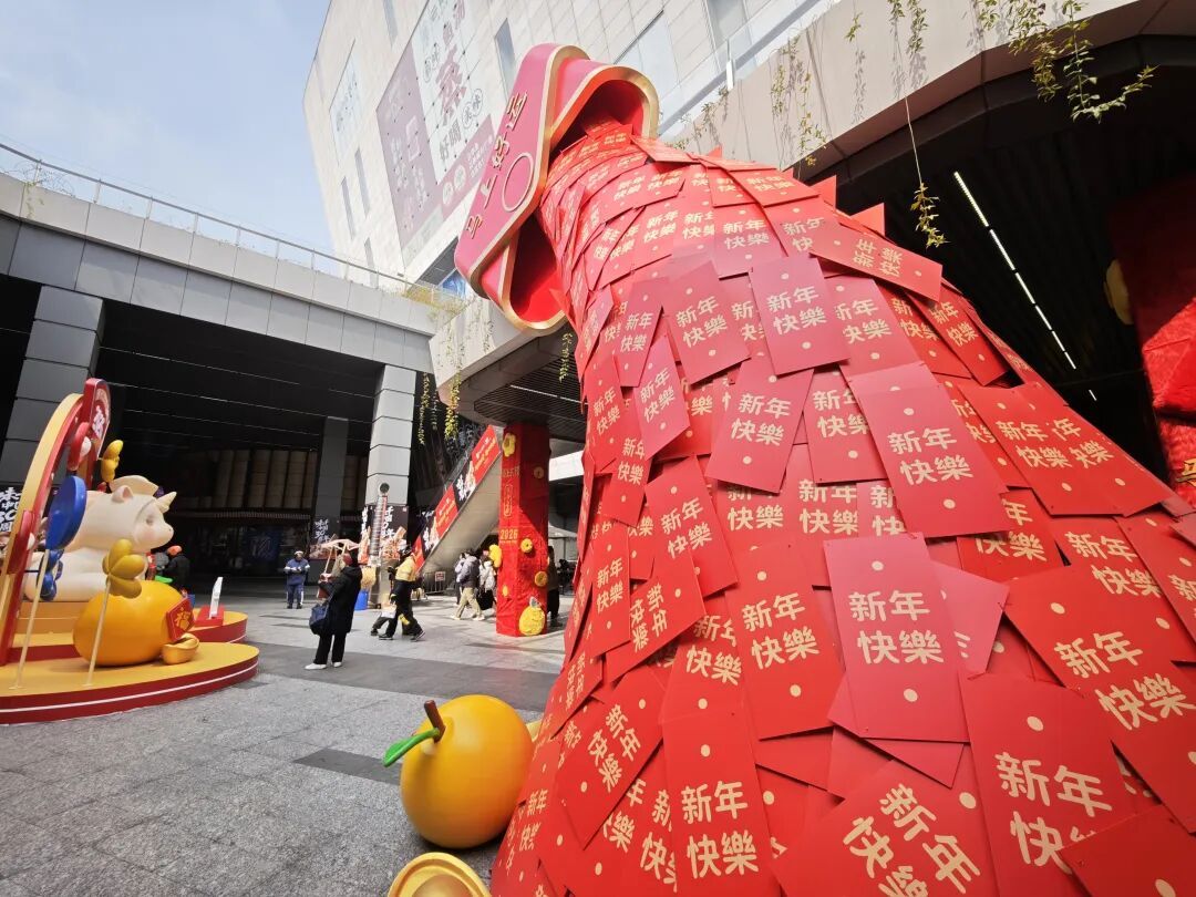 户外广场另一侧,一座由数百张红色祝福卡片拼接而成的巨型“福袋”雕塑,更是上演了“快乐到(倒)了”的趣味场景。红彤彤的福袋呈倾斜状,仿佛装满的新春祝福即将倾泻而出,福袋下方散落着金灿灿的元宝雕塑,寓意着“福运满溢、财运滚滚”。