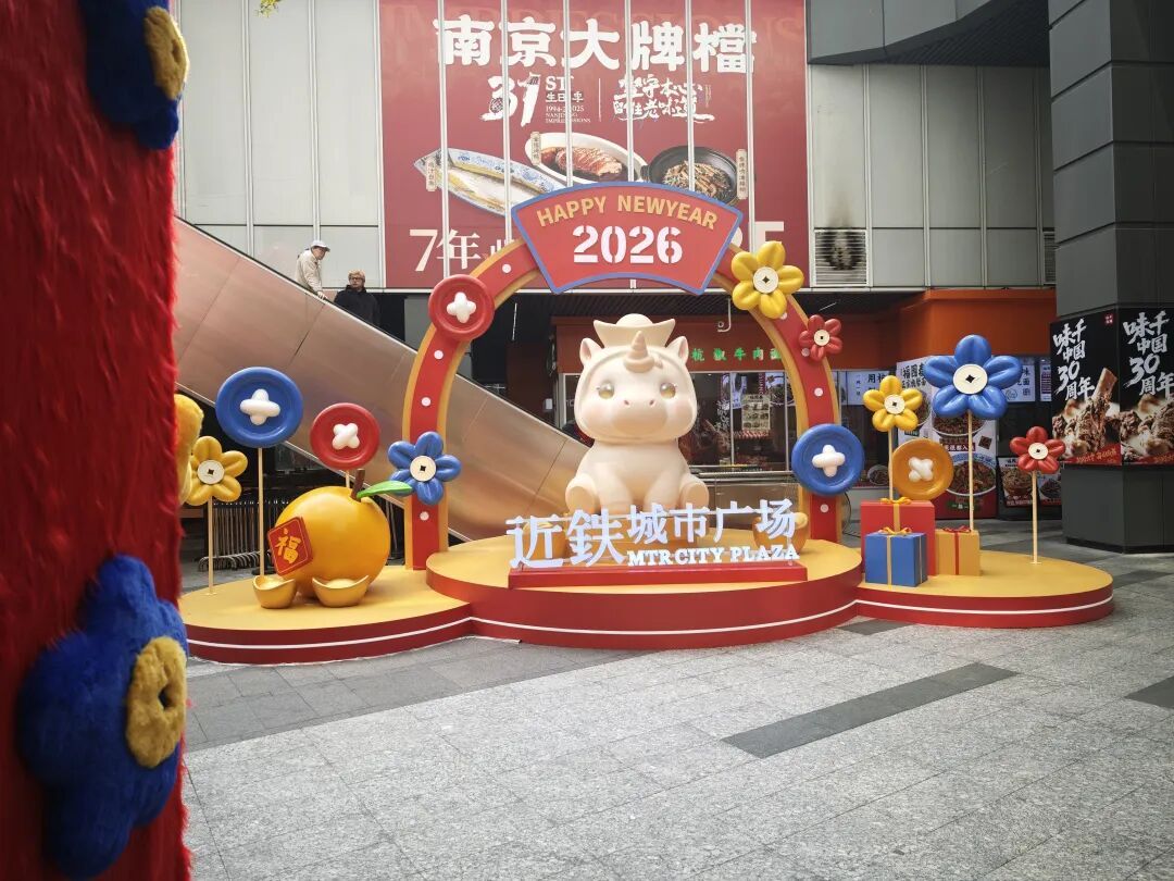 走进近铁城市广场户外广场,一组萌趣十足的马年主题美陈率先吸引眼球,成为市民拍照打卡的第一站。红金相间的拱门造型喜庆大气,拱门之下,一只圆润可爱的浅米色萌马雕塑憨态可掬。美陈两侧点缀着巨型福字、金桔装饰,以及彩色花朵装置与礼盒造型,红蓝黄的撞色设计活泼明快,将传统年味与潮流审美完美融合。