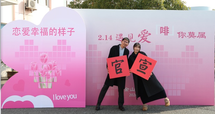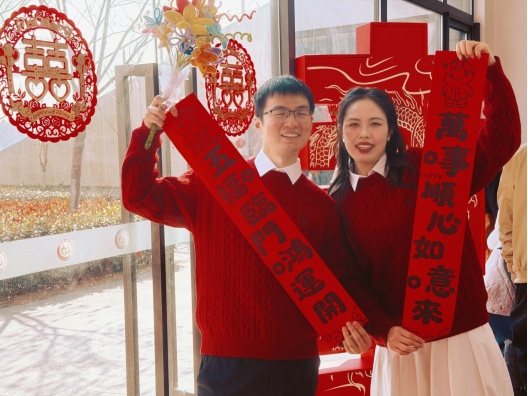 松江婚登大厅年味与喜悦交融,“囍”字、春联、爱心墙相映成趣,现场设“共绘未来”“亲密关系小测试”等互动游戏,新人在欢笑中感悟相处之道,在团圆氛围中幸福启航。