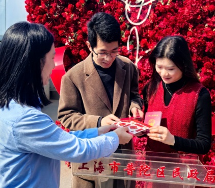 “昨晚还在乌鲁木齐地窝堡国际机场看漫天星光,今天就站在了我心心念念的幸福路上。”幸福路50号长宁区民政局婚姻登记处门口,来自新疆的孙女士语气里难掩激动。2月14日,春节前最后一个工作日,她和先生在上海这个满载祝福的幸福地标,完成了人生中最重要的登记仪式。本市各婚姻登记机关也迎来了一波节前登记小高峰。各婚姻登记机关提前制定应急预案,主动延长工作时间、增开服务窗口、优化办理流程,张灯结彩、喜气洋洋,将中华优秀传统文化融入每一个服务细节,让婚姻登记更具“中国味”。浦东、黄浦、静安、普陀、宝山等区开放特色颁证点;虹口区开设绿色通道,持返乡凭证者可优先办理,保障甜蜜领证与返乡团圆顺利衔接。今天全市共办理结婚登记2027对,其中“全国通办”511对。