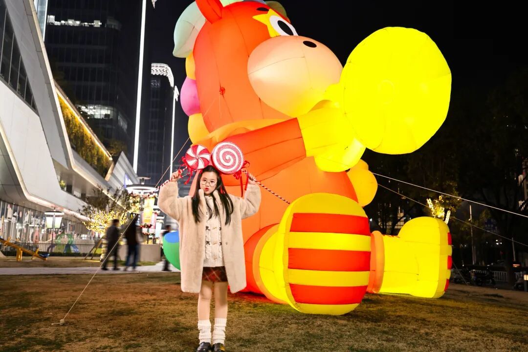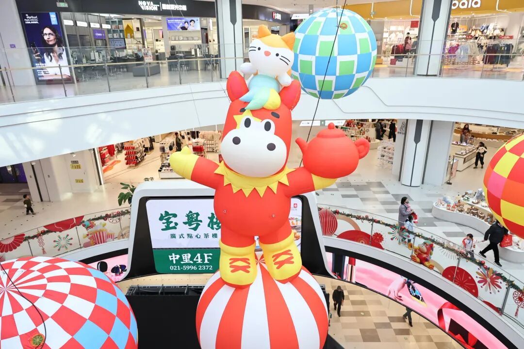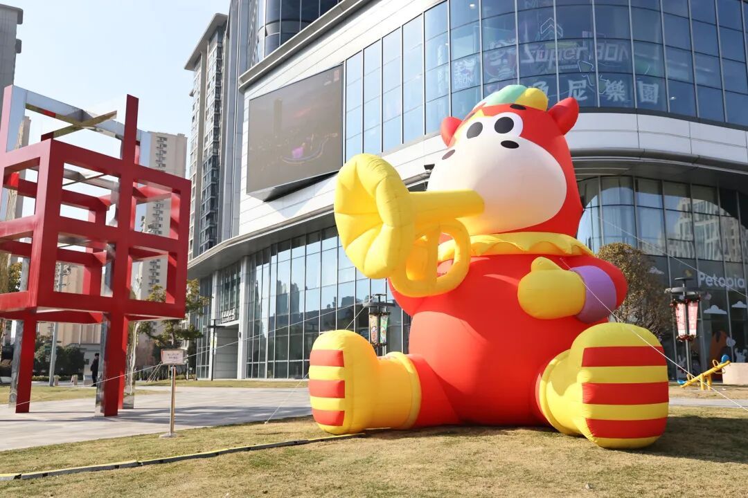 商场南里门口,高达6米的巨型马年吉祥物吹喇叭装置便率先奏响视觉上的欢乐乐章,这里是绝佳的“开门红”合影背景。