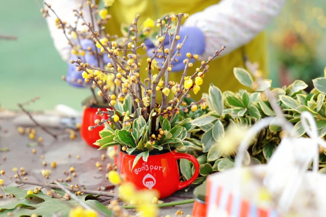 蜡梅园旁的蜡梅盆景与鲜切花销售处吸引了不少市民驻足挑选,黄灿灿的蜡梅配上红艳的南天竹果,显得格外喜庆。临走时,还可将这一缕幽香带回家中,增添年味。