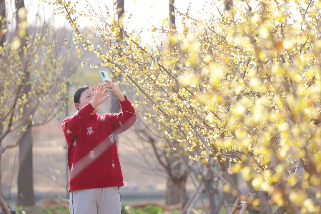园内小径蜿蜒,梅枝苍劲,更有部分枝条上点缀着玲珑的红色吉祥挂饰与手写祝语的迷你春牌,金蕊映红,新年喜气悄然缀满枝头。满目金梅与游人衣衫的那一抹亮色相映,交织出充满温度的新春画面。
