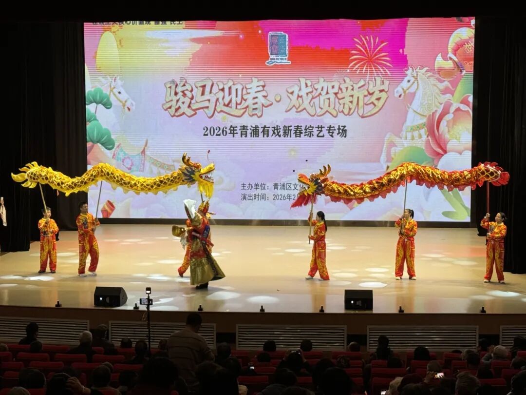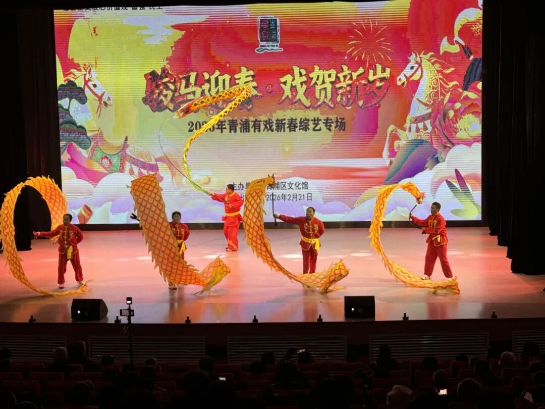最燃的当属舞龙表演!金色的长龙随着鼓点翻腾游弋,演员们配合默契,把龙的灵动与力量展现得淋漓尽致,瞬间点燃全场气氛,赢得满堂彩。舞龙表演者在下台后说:“今天来青浦表演特别开心!能把中国传统文化的魅力带给广大观众,给大家送上新年的喜庆,是我们的荣幸!”