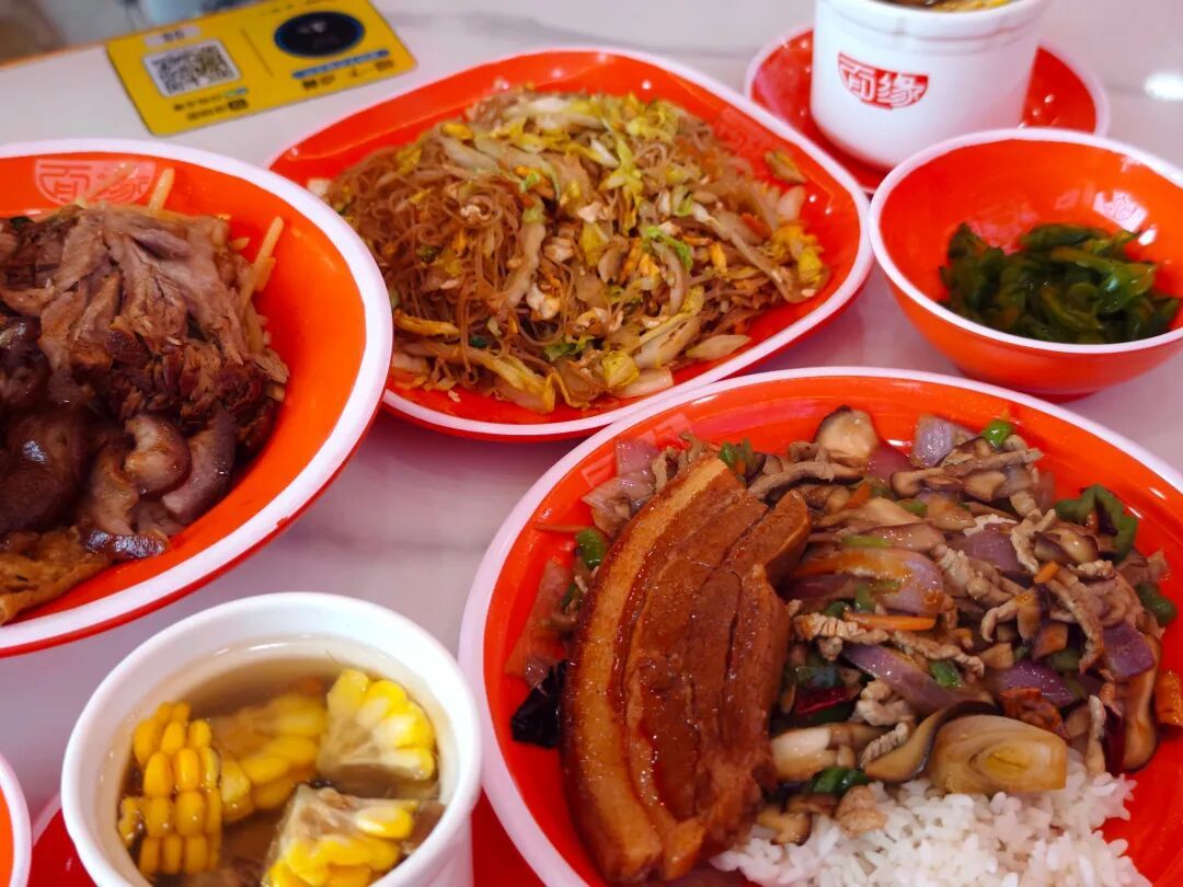 花上一二十元,就能吃得舒舒服服。花生酱拌面,香气醇厚;现炒盖浇饭,锅气十足。香菇肉丝盖浇饭是点单率颇高的一款,搭上一块炖得软糯入味的大肉,满口生香。招牌的隆江猪脚饭,猪皮Q弹劲道,肉香而不柴,配上清爽的土豆丝、豆芽和青菜,口感丰富,一份下肚,很是满足。