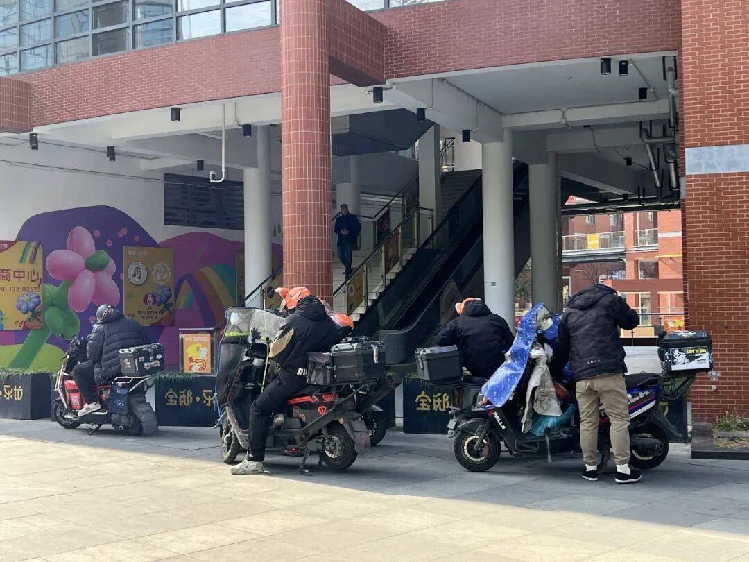 长江南路地铁站周边,同济创园、尚优里一带餐饮商户集中,非机动车流量大。平时有不少骑手小哥聚集在淞良路附近的广场等候接单。在街区工作人员走访中,他们普遍反映:充电是个“头疼事”——最近的电瓶车充电点位设在居民区内,距离较远,等单时若能顺便充电该多好。