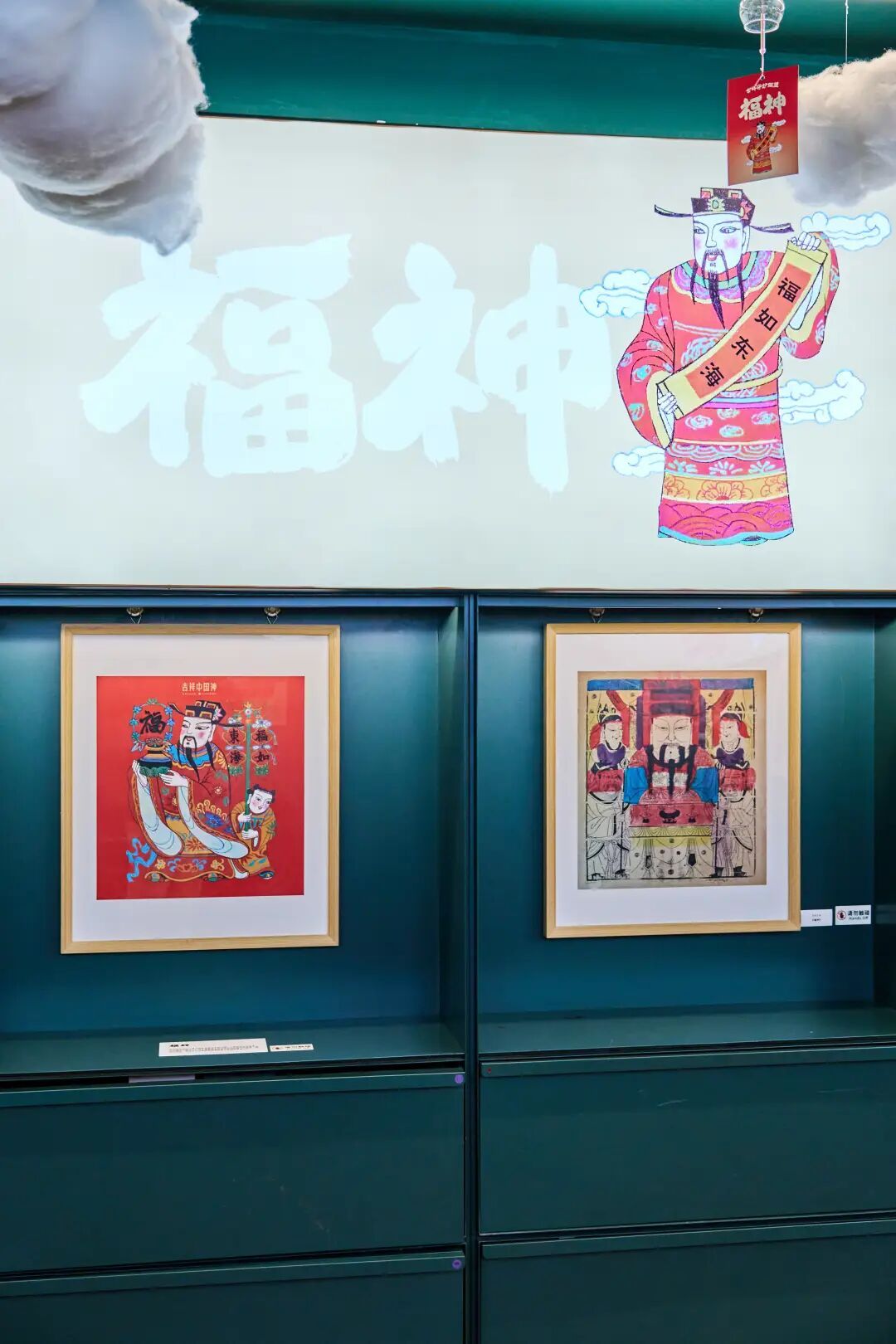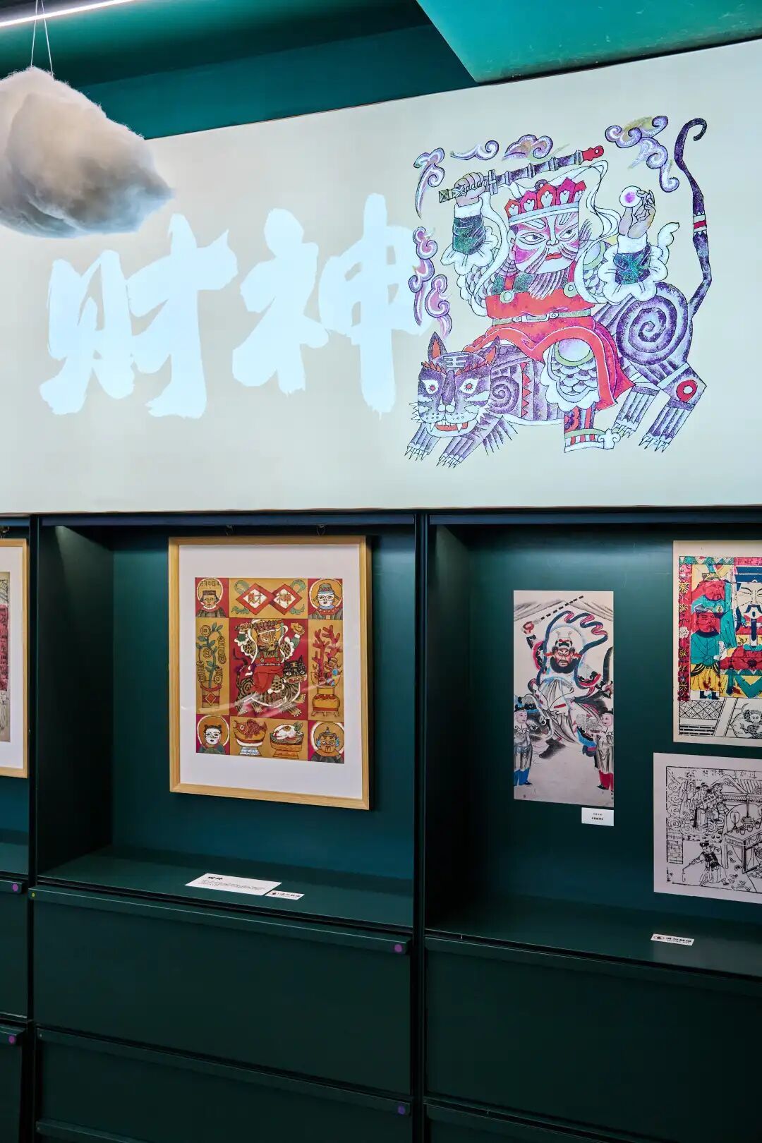抬头看,展厅顶部悬挂着大小不一的云朵与风铃,下方卡片上既有以十位神祇为主题的古诗,也有写满各种吉祥话的新春祝福。想了解更多新年风俗和古人生活的话,展厅内的图书展桌呈现了展览画作的出处之书《吉祥中国神》、茶神陆羽的专著《茶经》,以及《新年风俗志》《中国古代文化常识》等精选好书。