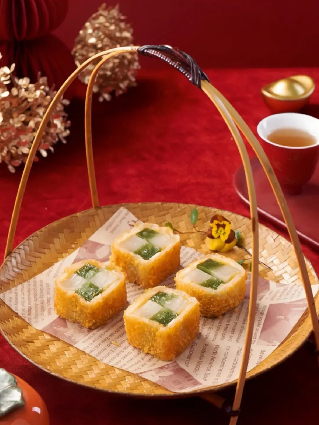“双彩迎春脆皮糕”将中山栾樨叶的清香与椰奶马蹄糕结合,外裹脆皮,炸至金黄,口感外酥里糯、清甜不腻。
