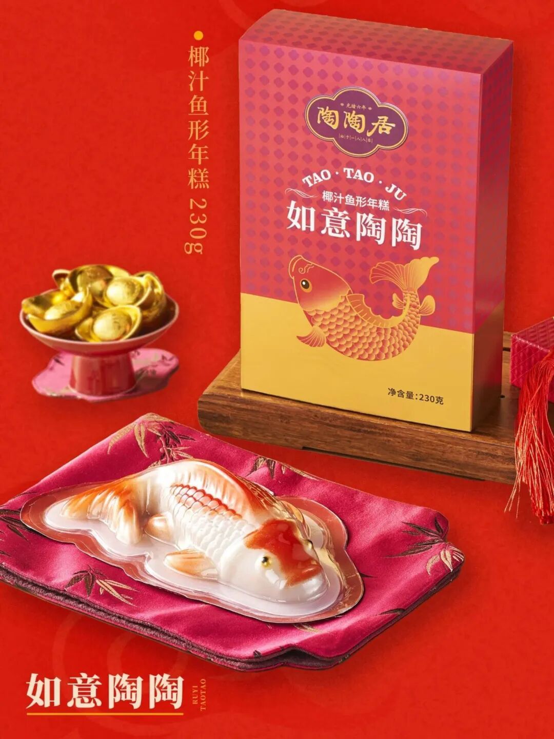 “岭南佳果饼酥礼盒”将荔枝、龙眼、佛手等本土果味融入酥点,带来满满的南国风情;“招财进宝”糯米糕则以金元宝造型登场,软糯香甜,寓意“有米有宝”;“如意陶陶”椰汁年糕做成锦鲤形态,寓意年年有余,成为不少顾客“必带”之选。