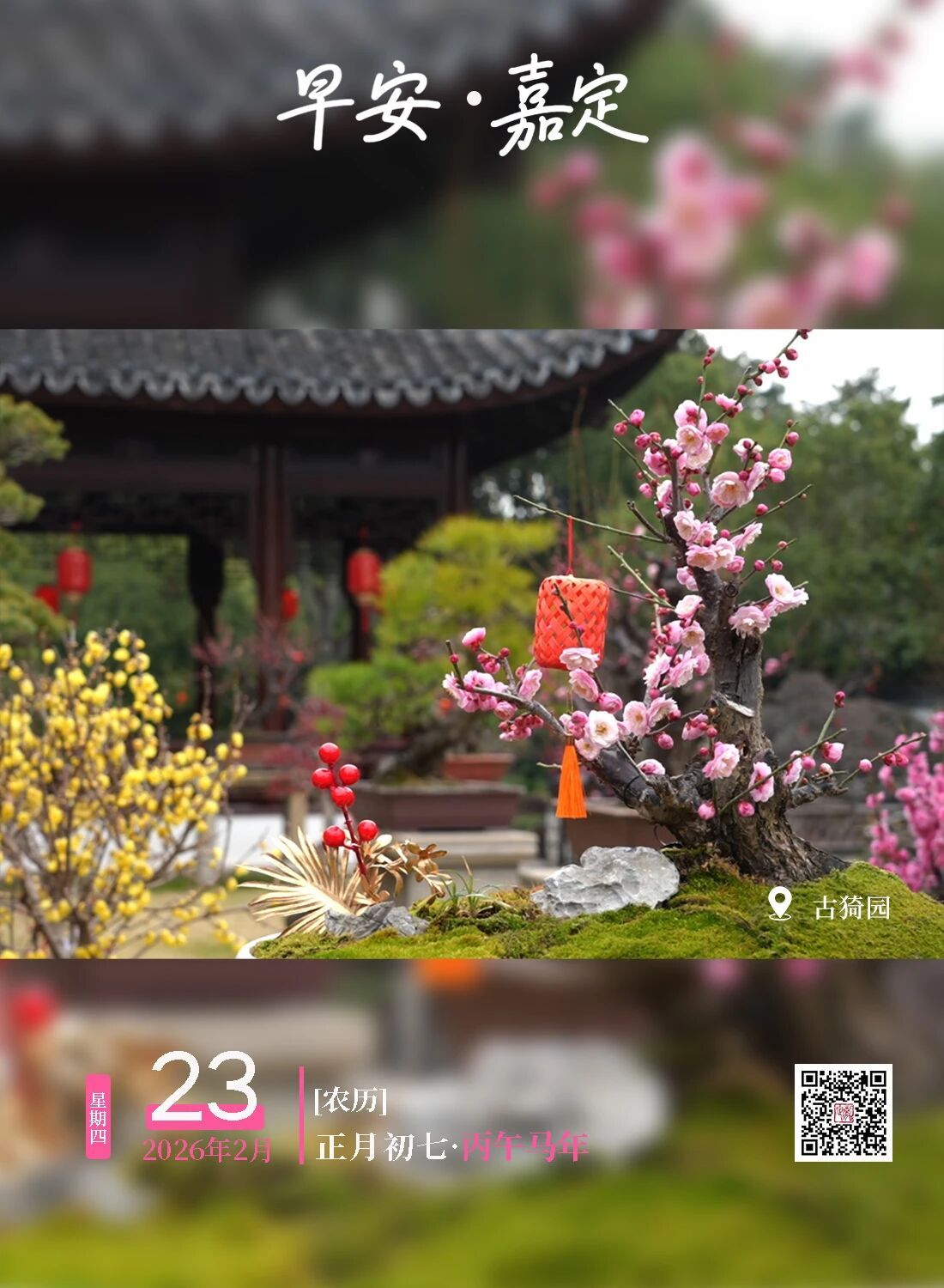 盆景里的红梅缀着新春的喜气,古建飞檐下藏着岁月的温柔。枝头红灯摇曳,暗香悄然浮动,新岁的美好正随春意慢慢生长。早安!愿你的今天如梅花般从容绽放,步履轻盈,所遇皆温柔。