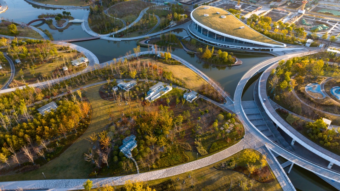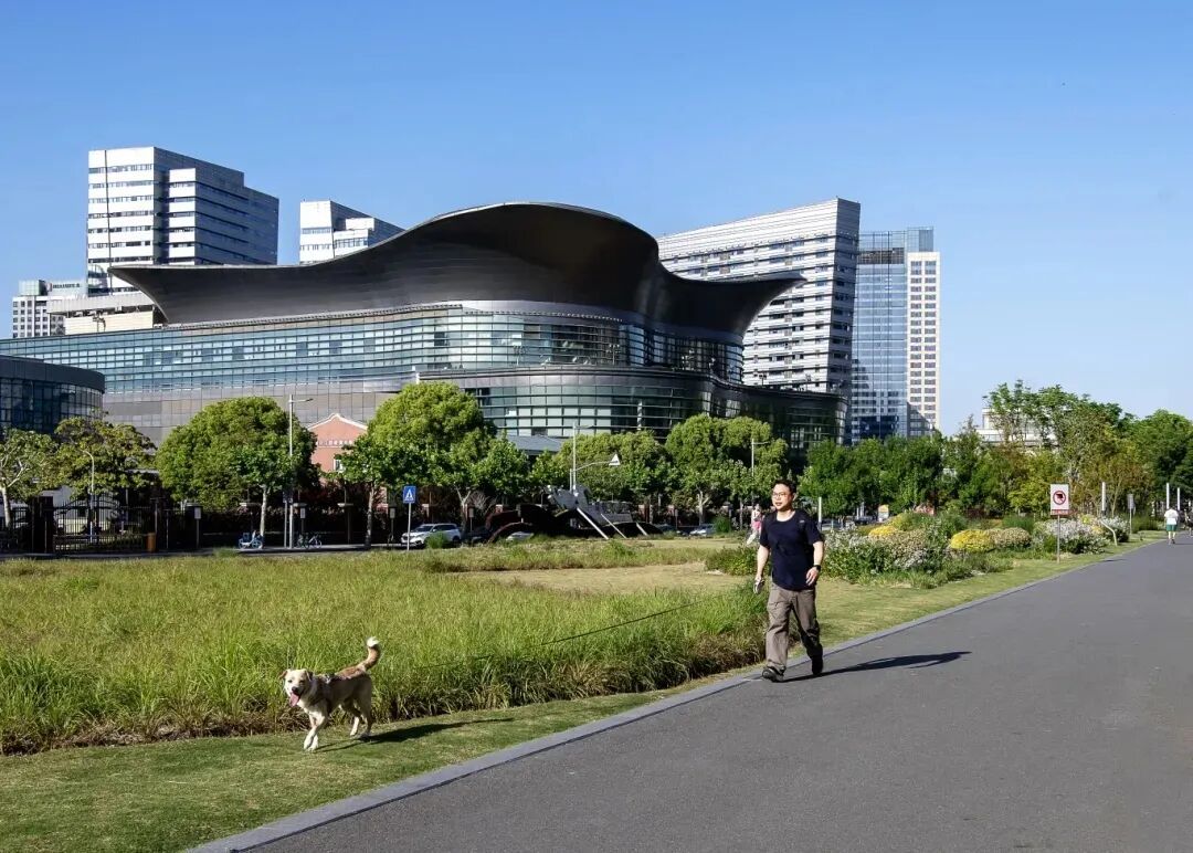 主出入口设于普陀区古浪路近敦煌路一带,从此入园可便捷抵达A、B两大官方划定的宠物友好区。这座占地100公顷的绿地,被誉为上海西北部的“疗愈之肺”,以广袤绿意与匠心设计,成为都市中难得的自然秘境。开阔的疏林草地被暖调霞光浸润,蜿蜒水系穿梭其间,景致兼具磅礴气度与静谧之美,尽显自然本真韵味。公园设计取“行云流水”之意,以中国传统书法与舞蹈为灵感,蜿蜒步道巧妙串联起各类空间,登高俯瞰,流畅线条交织成一幅灵动的大地艺术作品,让自然与艺术在此和谐共生,毛孩子可在此玩耍。绿地免费对外开放,十分适合全家携宠露营、徒步赏景。