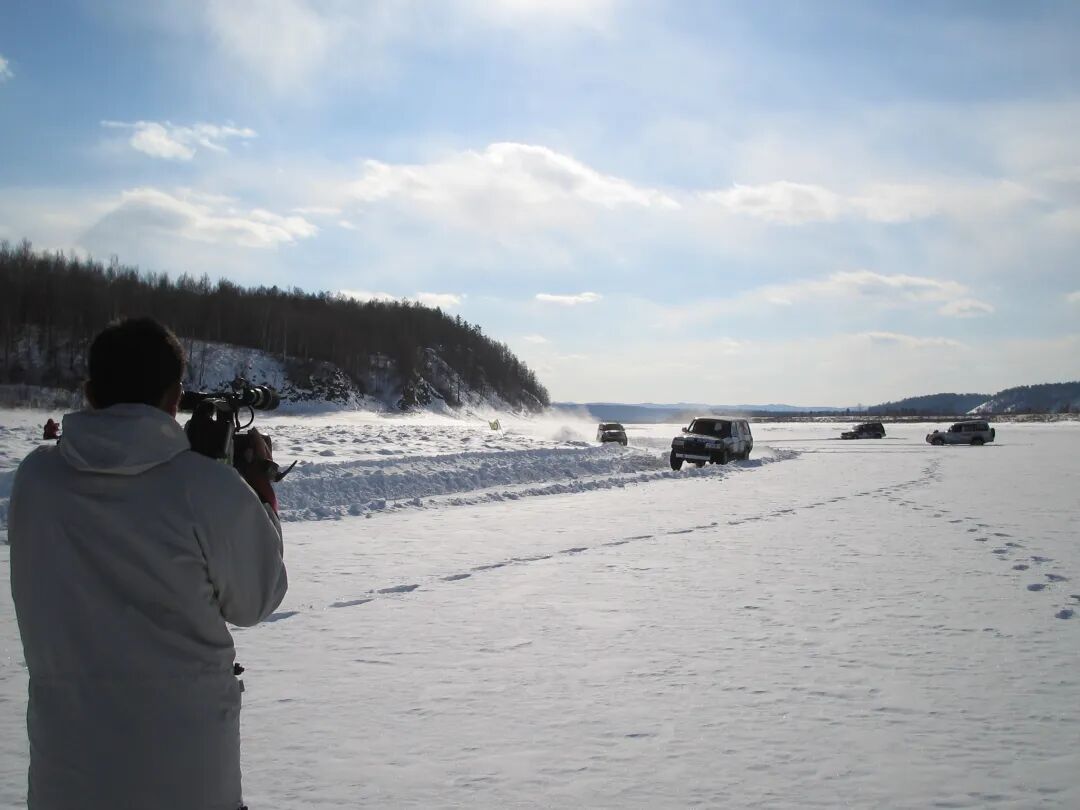 我们的采访车是辆四驱三菱越野车,在江面推出的赛道上疾驶。赛道弯弯曲曲,有的地方仅距俄罗斯20来米。车颠簸向前,背太阳一侧的车窗玻璃,不一会儿就结起一层薄薄的冰霜。到达指定地点,在赛道旁架起摄像机,等待赛车过来。江面上,有长长的树枝插着,那是钓鱼的人留下的。脚下的江冰冻得结实,趴着往下看冰冰相叠。