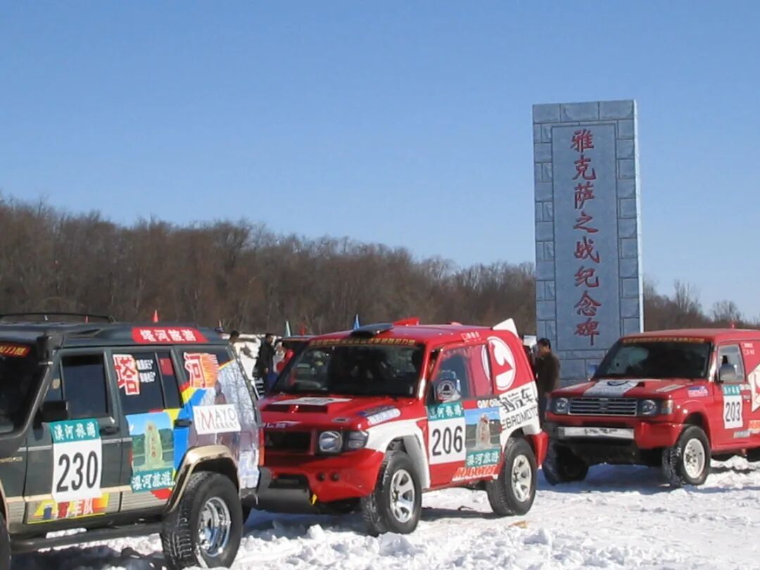 4月1日,我搭着王裁判长的车前往,将近下午一点,前方出现一座碑,赛段起点到了。那里冰雪铲尽,不少地方裸出河床上大大小小的鹅卵石。三级木头台阶上的碑,约4米多高1米多宽。细看是木头碑,四周钉喷绘布,淡天蓝色的花岗岩图案上印着字。正面红色新魏碑体:雅克萨之战纪念碑。背面文字是那场战斗简述。漠河县委宣传部徐副部长告诉我:原碑在下游10多里处,早就没了,现准备重建。其实,有没有碑并不重要,只要书中记着,心里不忘。