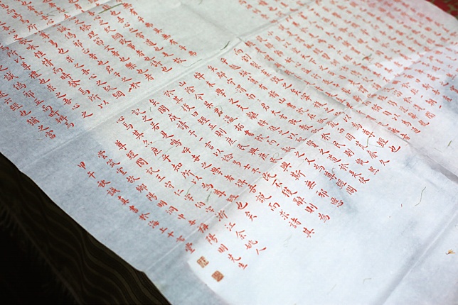 王 我主要练楷书、行书,也懂些篆书和草书,篆书入门难需记写法,草书要求高得有基础才能写好。我用朱砂红写《尊经阁记》,朱砂能定心,写的时候会特意放慢速度,一笔一画沉下心来。书法特别考验心性,心乱笔画和结构就容易出问题,字会显得“散”。