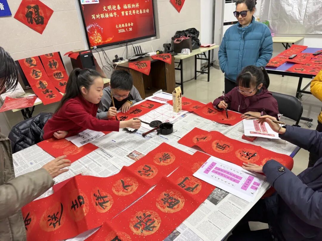 在辽一、星泰、吴家浜等居民区举办剪纸、写福字等手工活动,新年祝福凝于纸墨之间;又一村居民区将写好的春联张贴在各个楼栋,邻里情谊和人间年味从指尖油然而生。