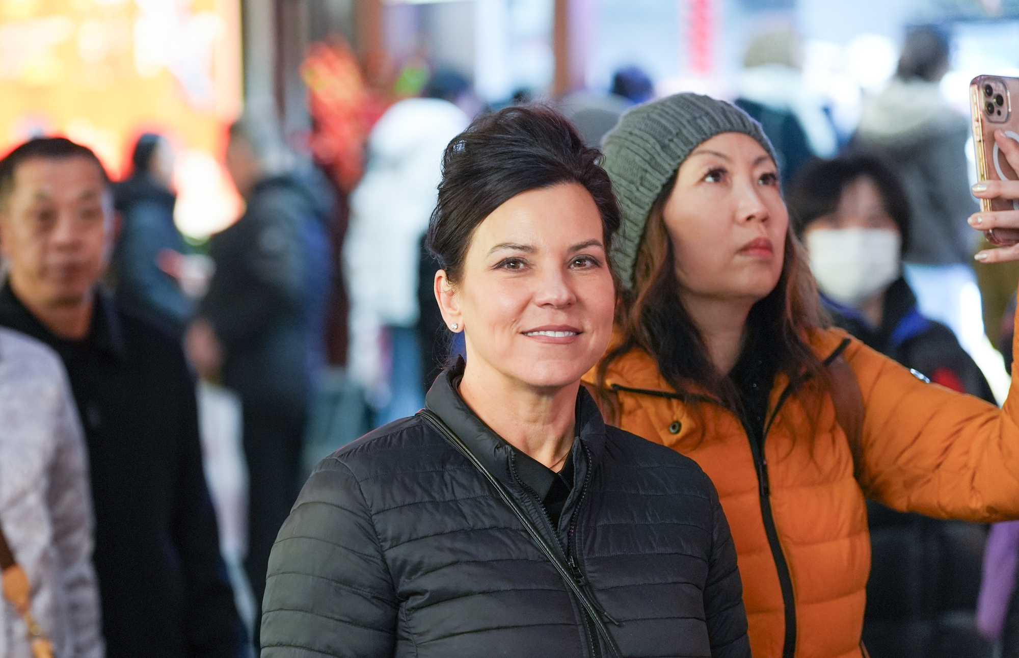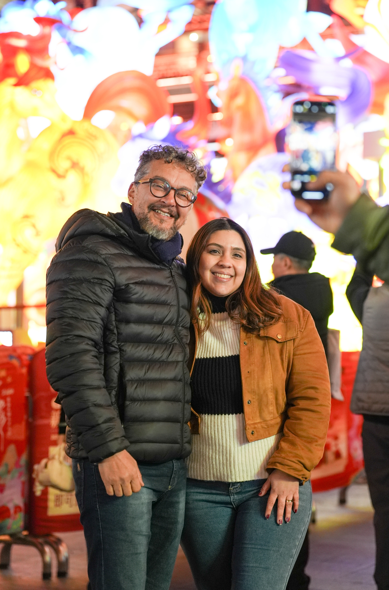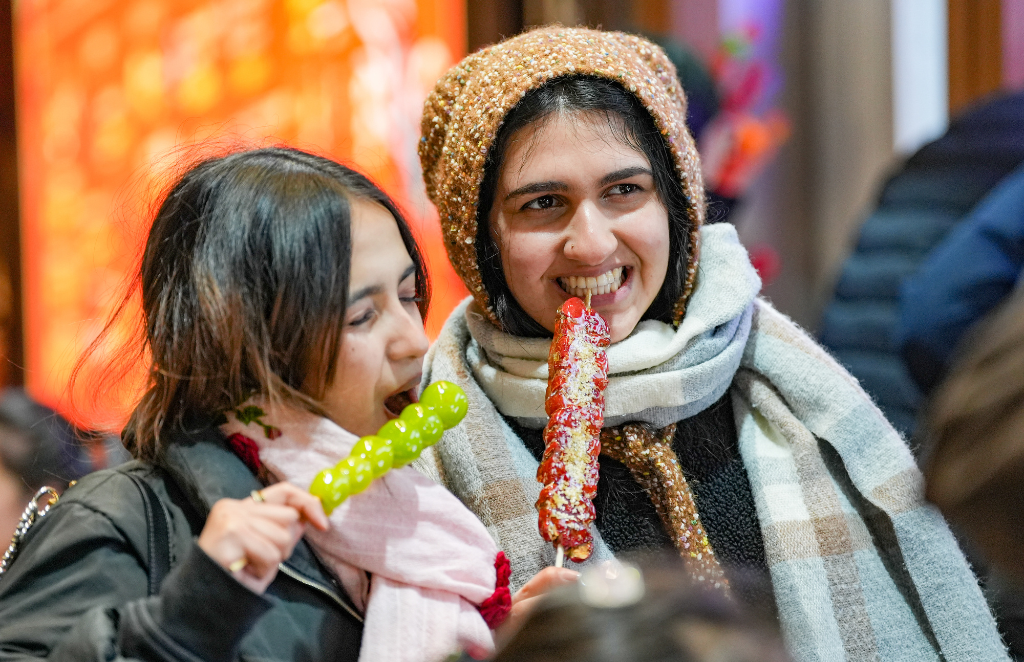 看,这两位外国姑娘举着刚买来的冰糖葫芦,眼神里是对东方味道的好奇;那位小伙在巨大的生肖马灯下仰望,瞳孔里映出璀璨光影,写满了“Amazing”;还有扛着孩子的外国老爸,孩子的笑脸和手中的兔子灯一样灿烂……