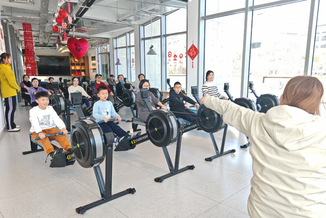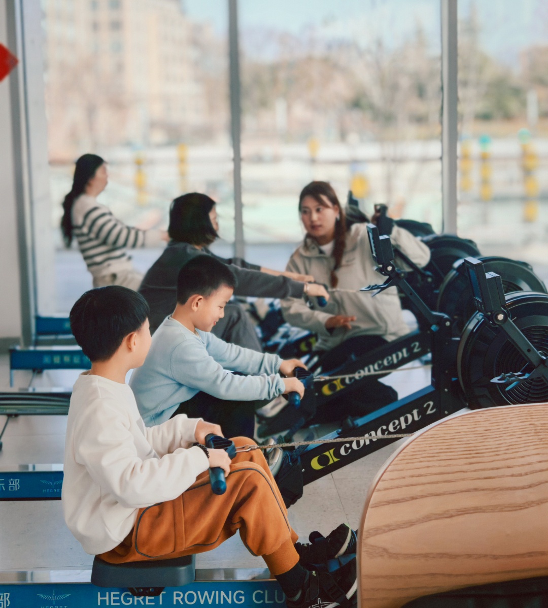水岸之上脚步铿锵,水岸旁的室内场馆,另一种“划桨”运动也在蓄力。在同步开启的赛艇训练营,市民们正围着陆上划船器挥汗如雨。虽然没有真的下水,但在专业教练的分解教学下,大家从握桨姿势到核心发力,学得有模有样。