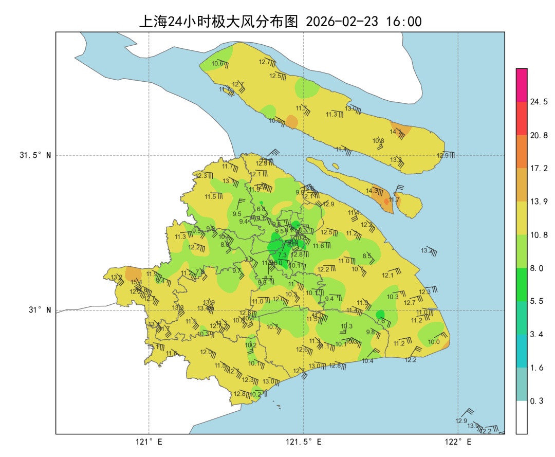今天上午阳光开场,下午云系逐渐增多。在冷空气影响下,气温较昨日明显下滑,各区白天最高气温在13~16℃之间,市区徐家汇站定格在15.4℃。风力较强,局部最大风力达6~7级,多区发布大风蓝色预警信号,风寒效应明显。
