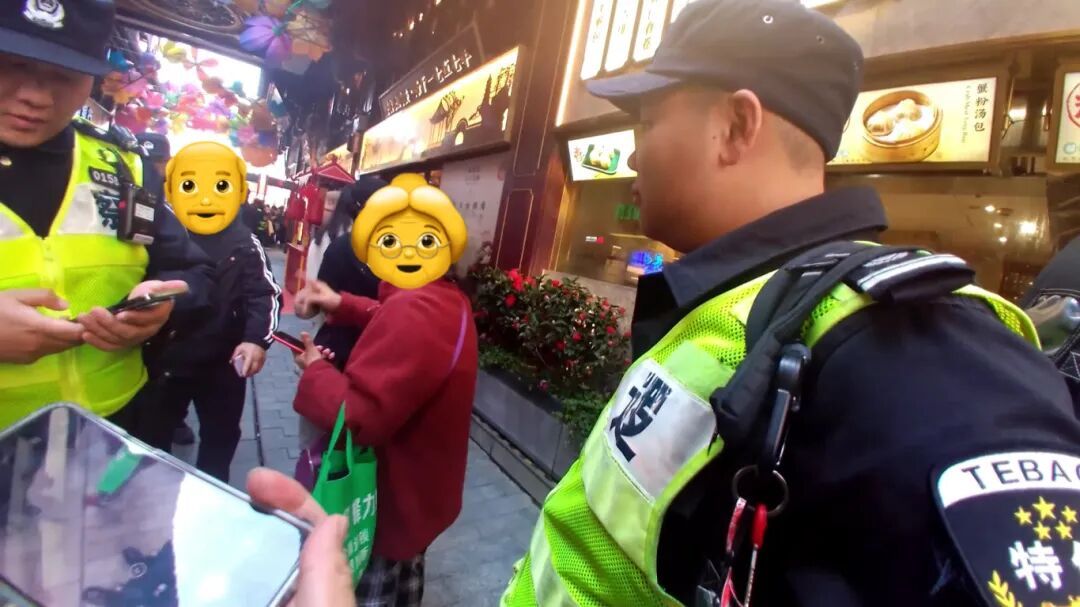 仅仅过了5分钟,指挥室就传来了好消息:老先生已经被找到了!原来,老先生在走散后迷失了方向,一直在豫园5号门附近徘徊,幸运的是被另一组巡逻民警发现。民警在仔细核对信息确认无误后,立即小心翼翼地护送老太太前往5号门。当两位老人远远望见彼此的那一刻,老太太激动得眼眶都红了,她小跑着上前,嘴里反复念叨着“急死我了”。在民警的提议下,两位老人与帮助他们重逢的民警一起合影留念,记录下这温暖的一刻。