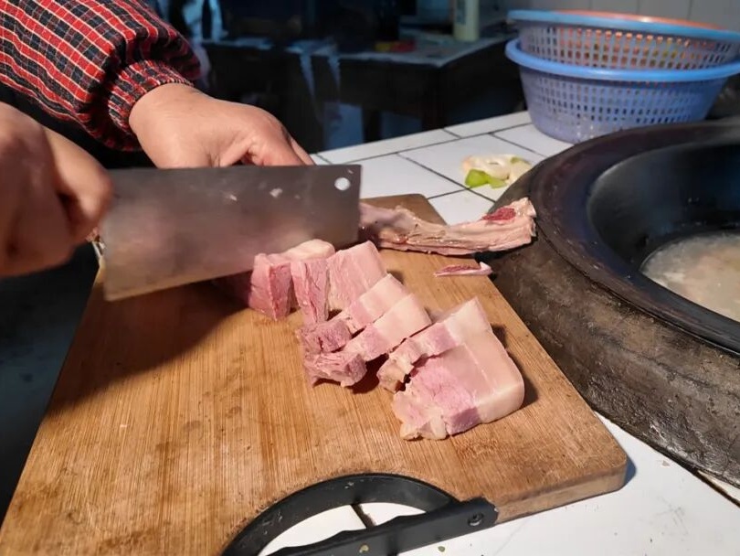 徐行镇红星村村民潘品芳家的厨房里,年味早已在案板上铺开。潘品芳先把自家腌制的咸肉冷水下锅,再把鲜肉切成均匀方块,一并入锅。