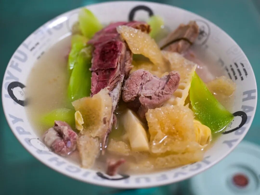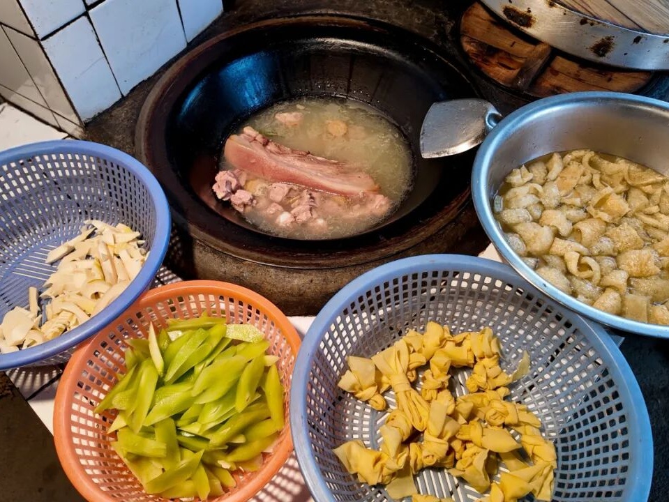 一个半小时后,锅里的肉已酥烂,她掀开锅盖,将切好的春笋、莴笋、肉皮、百叶结倒入锅中,再盖紧盖子继续炖煮。随着时间推移,锅内香气愈发浓郁,隔着院墙都能飘散出去。