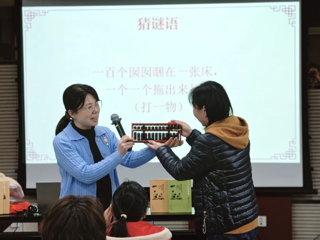 大年初七下午的宝山区图书馆多功能厅,化身为一场雅致又欢乐的新春联欢会现场:大小读者跟着魔法阿姨张弘,坐上“时光机”,穿越回60多年前的丰子恺家的春节,在“日月楼”里对对子、猜谜语、击鼓传花、玩特别的“桌游”、学唱少年版的“长亭外”,还有乡间叫卖声里的新年倒计时……这场充满互动乐趣和诗情画意的沉浸式读书会,给宝图新春系列活动一个精彩的收尾。