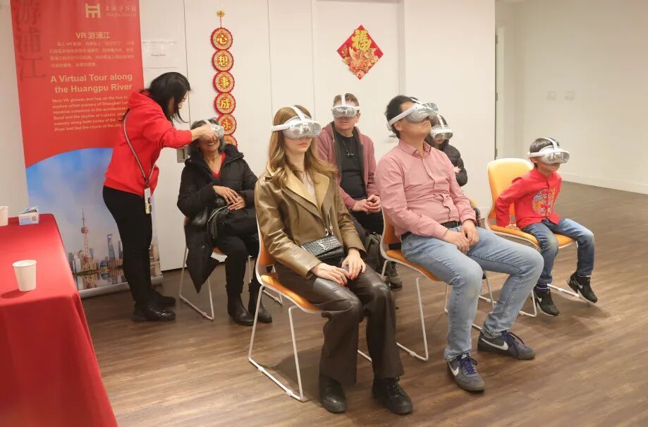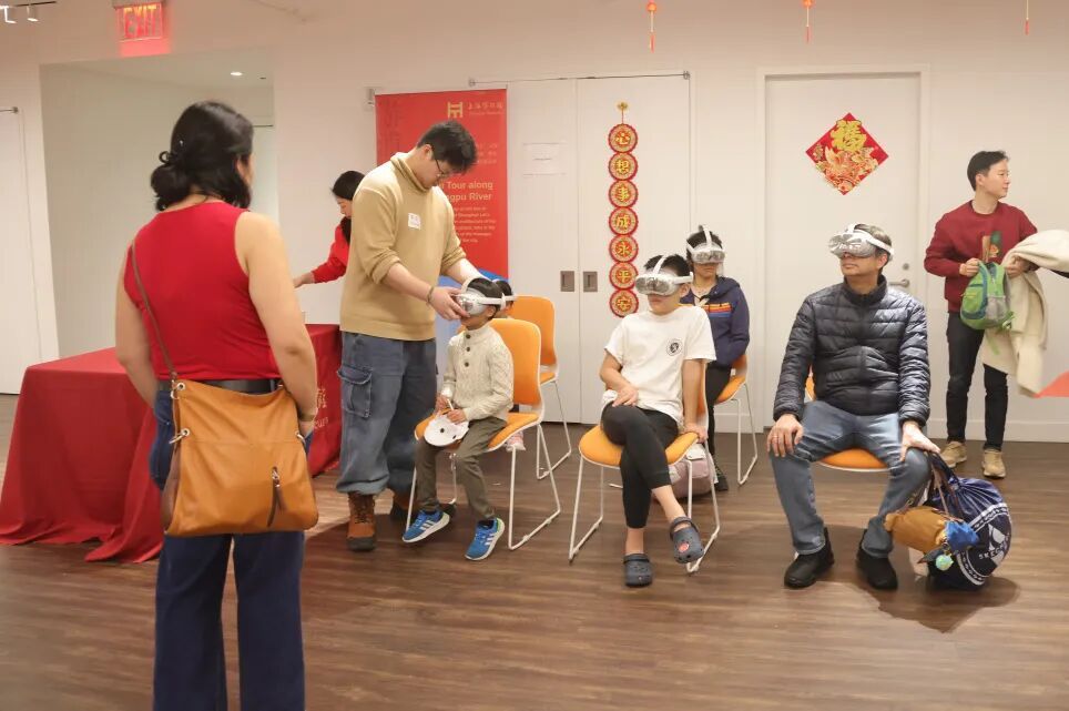 在二楼多功能厅内,中国非遗“马灯彩”背景板成为不少亲子家庭合影留念的打卡点。“VR游浦江”科技体验带领观众从美国“穿越”到上海浦江两岸,沉浸式感受外滩万国建筑群与陆家嘴现代天际线的交相辉映。