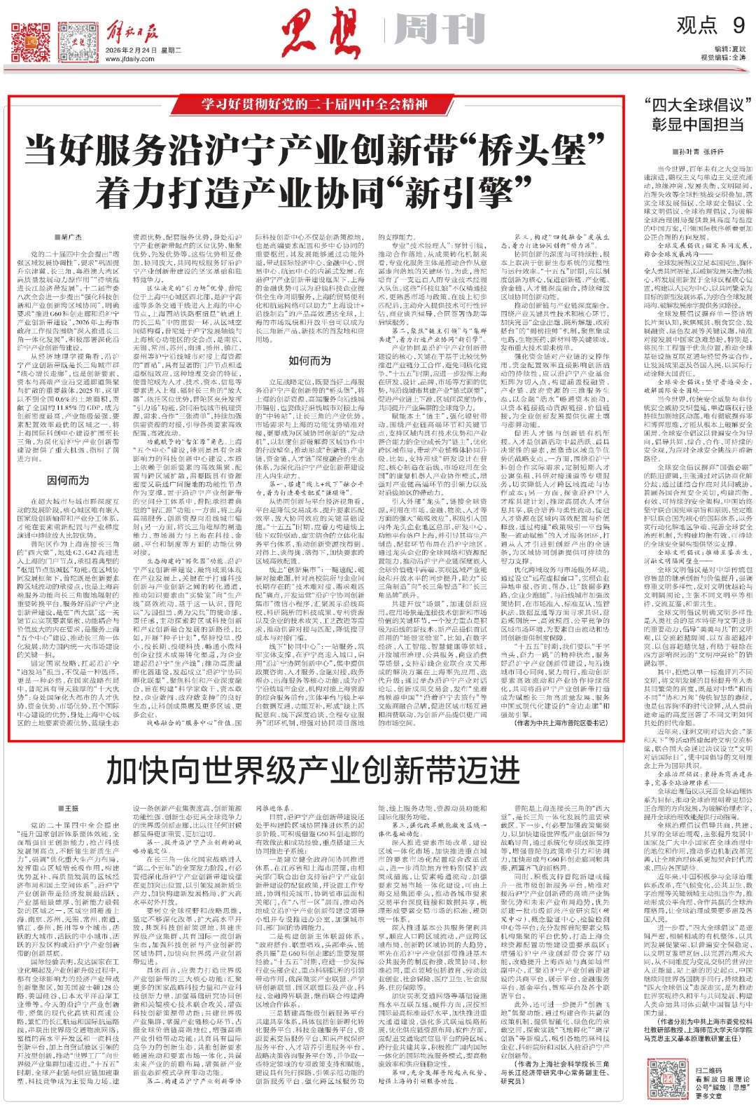2026年2月24日,《解放日报》思想周刊“学习好贯彻好党的二十届四中全会精神”专栏刊发中共上海市普陀区委书记胡广杰署名文章《当好服务沿沪宁产业创新带“桥头堡”,着力打造产业协同“新引擎”》,全文如下↓↓↓