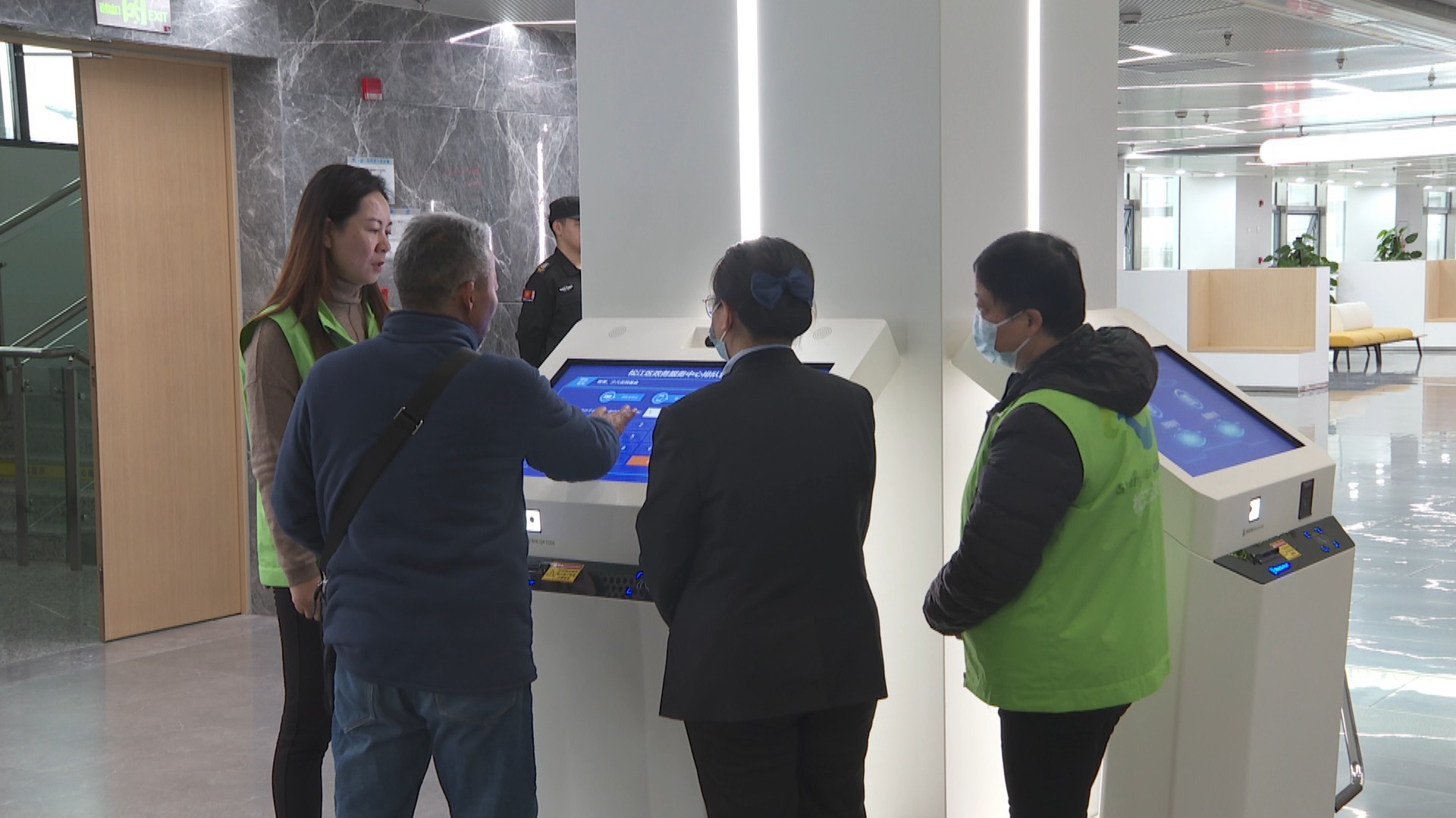 在大厅入口处的咨询服务台和取号机旁,不时有市民上前询问,身着绿色马甲的引导员耐心解答,帮助他们在取号机上选择对应业务类别,随后引导他们前往相应区域等候办理。