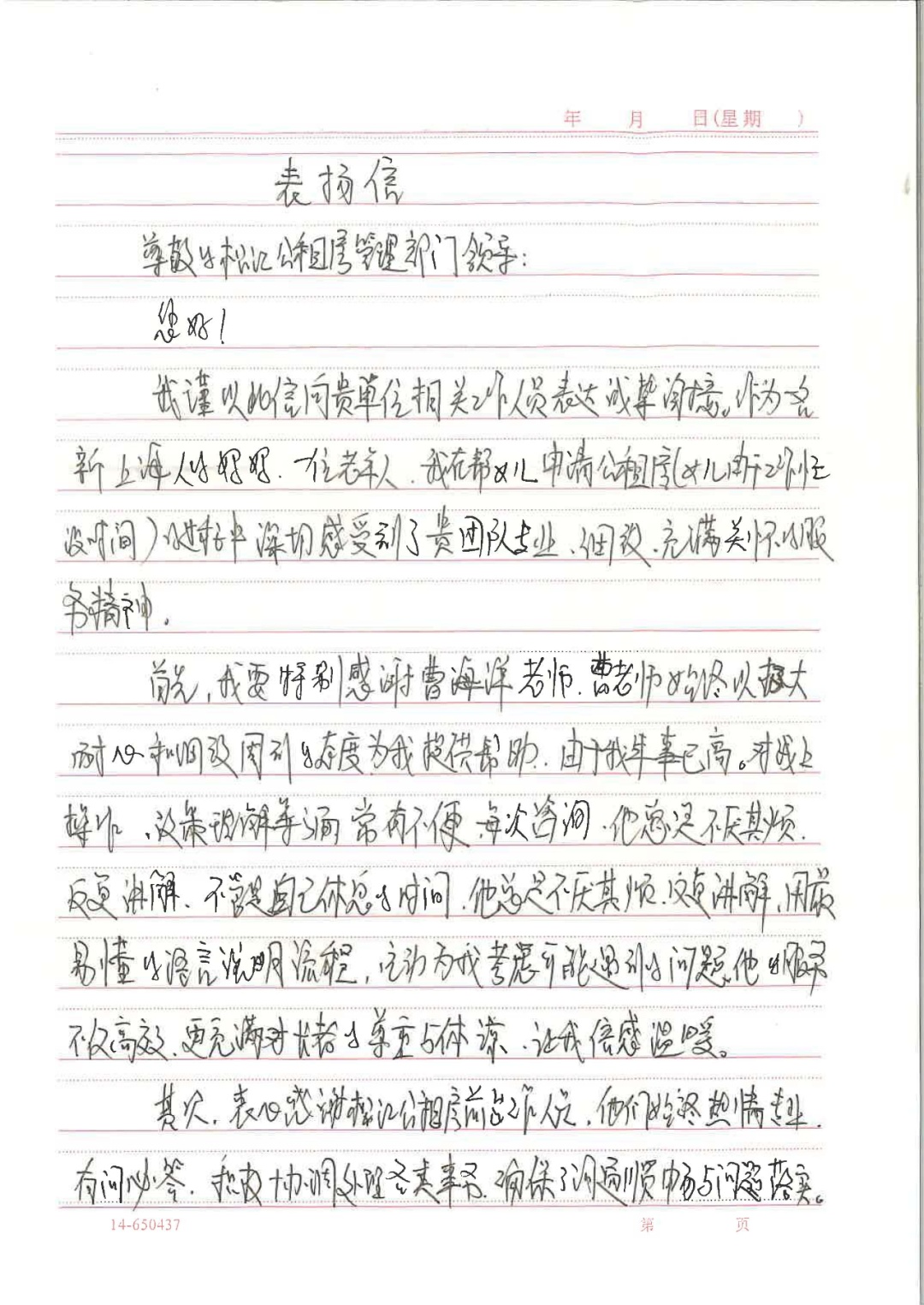 近日,公租房公司收到一封来自山东泰安的手写感谢信。一位新上海人母亲,在代为女儿办理公租房申请的过程中,对窗口服务团队的专业、细致与暖心表达了高度认可与真诚感谢,这也成为我们服务日常中温暖的一页。