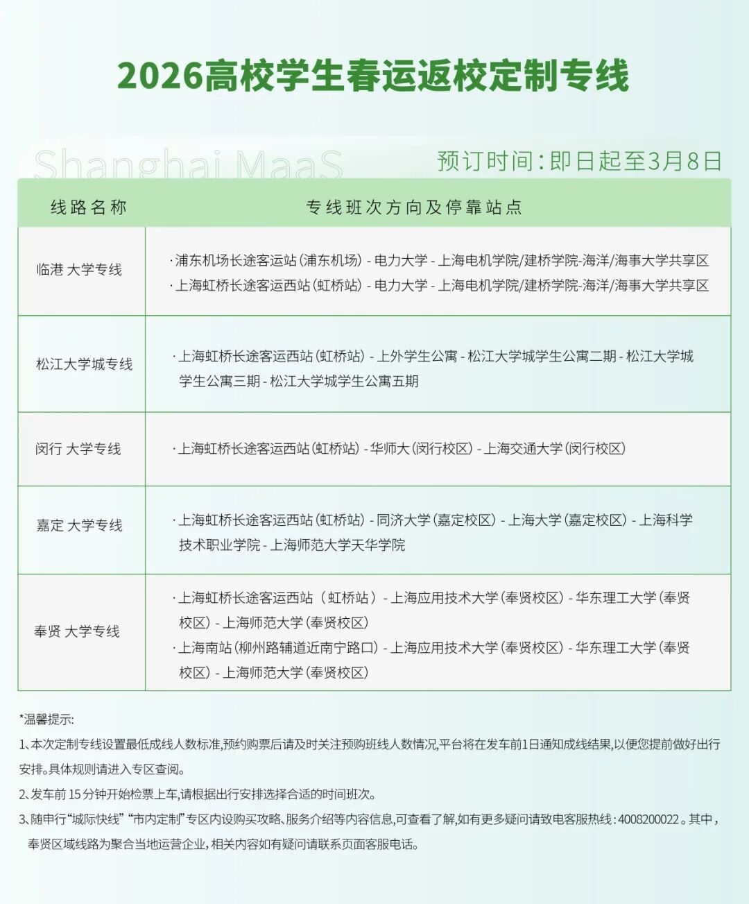 据市交通委介绍,2026年春运过半,上海各大高校即将迎来新学期返校客流高峰。为保障广大高校学子便捷、安全返校,本市“出行即服务”(MaaS)平台“随申行”联合多家运力企业,于2月27日至3月8日期间开通“2026春运回沪返校定制专线”。