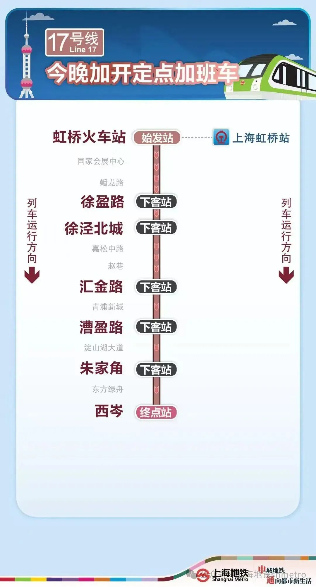 为满足春运期间乘客夜间出行需求,今晚(2月24日),2号线加开定点加班车,虹桥火车站站往龙阳路站加开至次日(2月25日)2时20分;9号线加开定点加班车,上海松江站站往杨高中路站加开至次日(2月25日)0时20分;10号线加开定点加班车,虹桥火车站站往五角场站加开至次日(2月25日)0时;17号线加开定点加班车,虹桥火车站站往西岑站加开至次日(2月25日)0时。定点加班车只停靠指定站点。