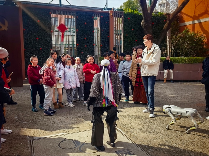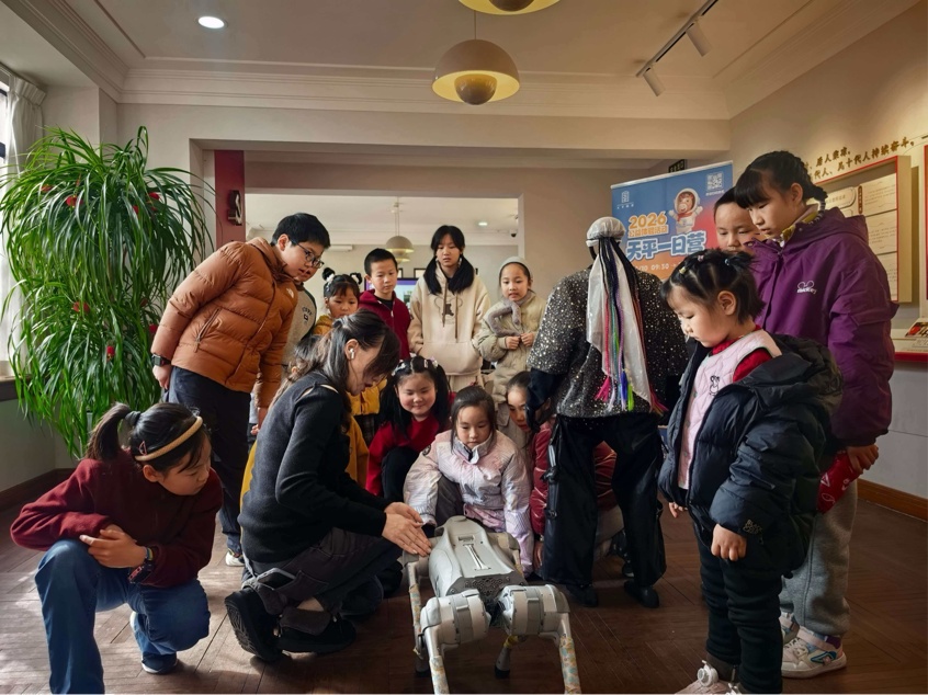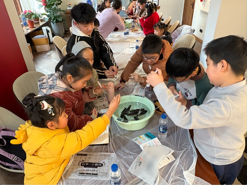 午后前往66梧桐院,前沿科技体验环节点燃了孩子们的热情。AI机器人挥手、比心、互动交流,机器狗灵活完成跳跃、空翻等炫酷动作,引得现场阵阵欢呼。孩子们还主动上前与机器人、机器狗展开趣味赛跑,清脆的笑声回荡在现场。在DIY科学实验课上,来自上海交通大学的研究生志愿者带领孩子们制作简易潜水艇,细致讲解浮力原理,当亲手制作的潜水艇在水中自由沉浮时,孩子们眼中闪烁着好奇与喜悦,也在实践中解锁了新的科学知识。