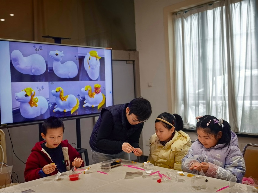 上午9点半,孩子们走进上海工艺美术馆,开启一场传统文化与匠心艺术的探索之旅。馆内竹雕、玉雕、牙雕等工艺珍品精巧绝伦,尤其是微雕作品《蛛丝墨迹》,在放大镜下呈现出《红楼梦》文字与金陵十二钗小像,让孩子们近距离感受到传统技艺的精妙与震撼。随后,非遗代表性传承人汤健现场指导大家体验面塑制作,彩色面团在孩子们手中揉、捏、搓、压,一只只寓意吉祥的福马造型生动可爱,承载着新年的美好祝愿。