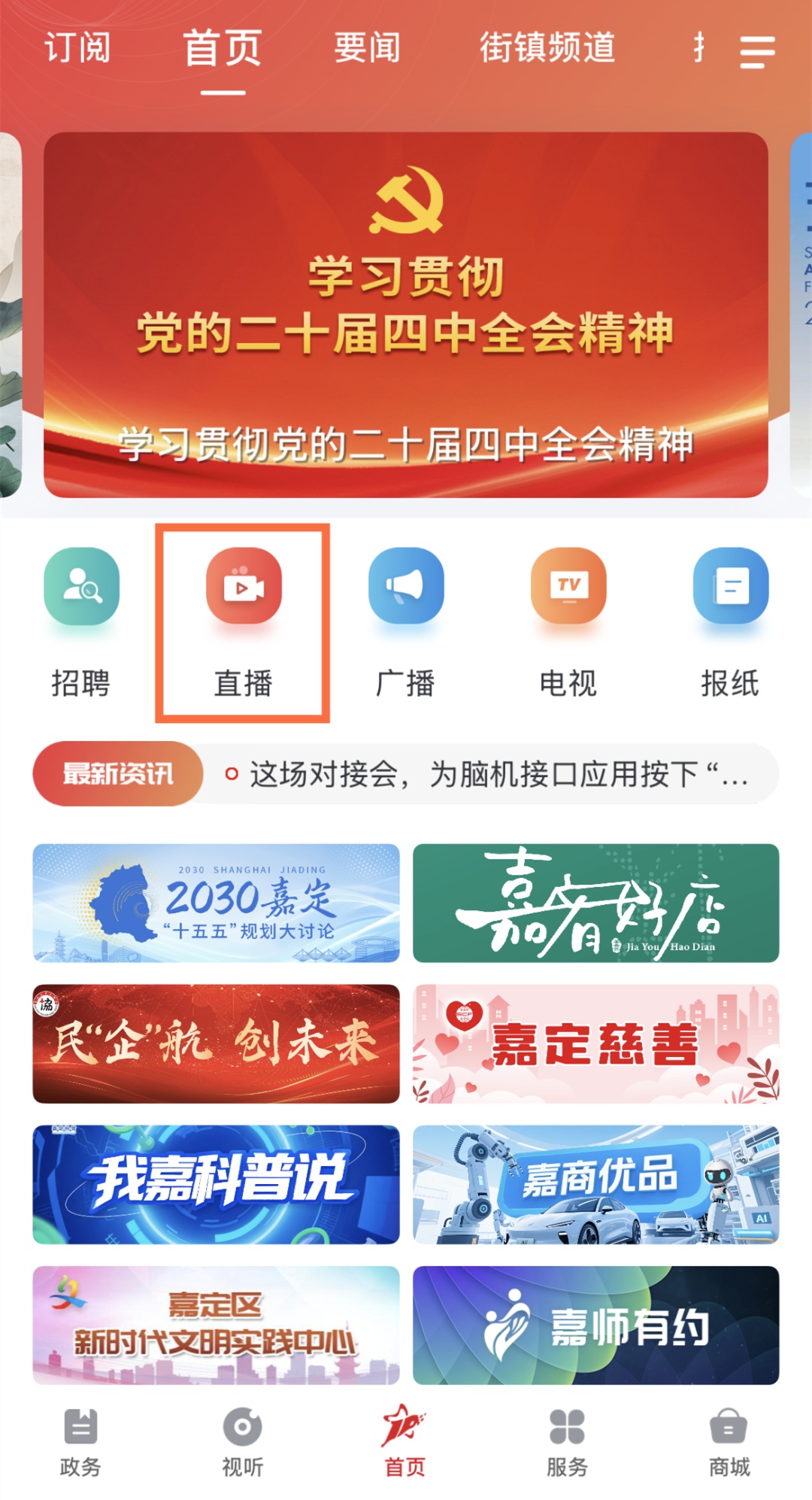 在“上海嘉定”APP首页中,点击“直播”按钮,可以回看“健康有道”往期节目。